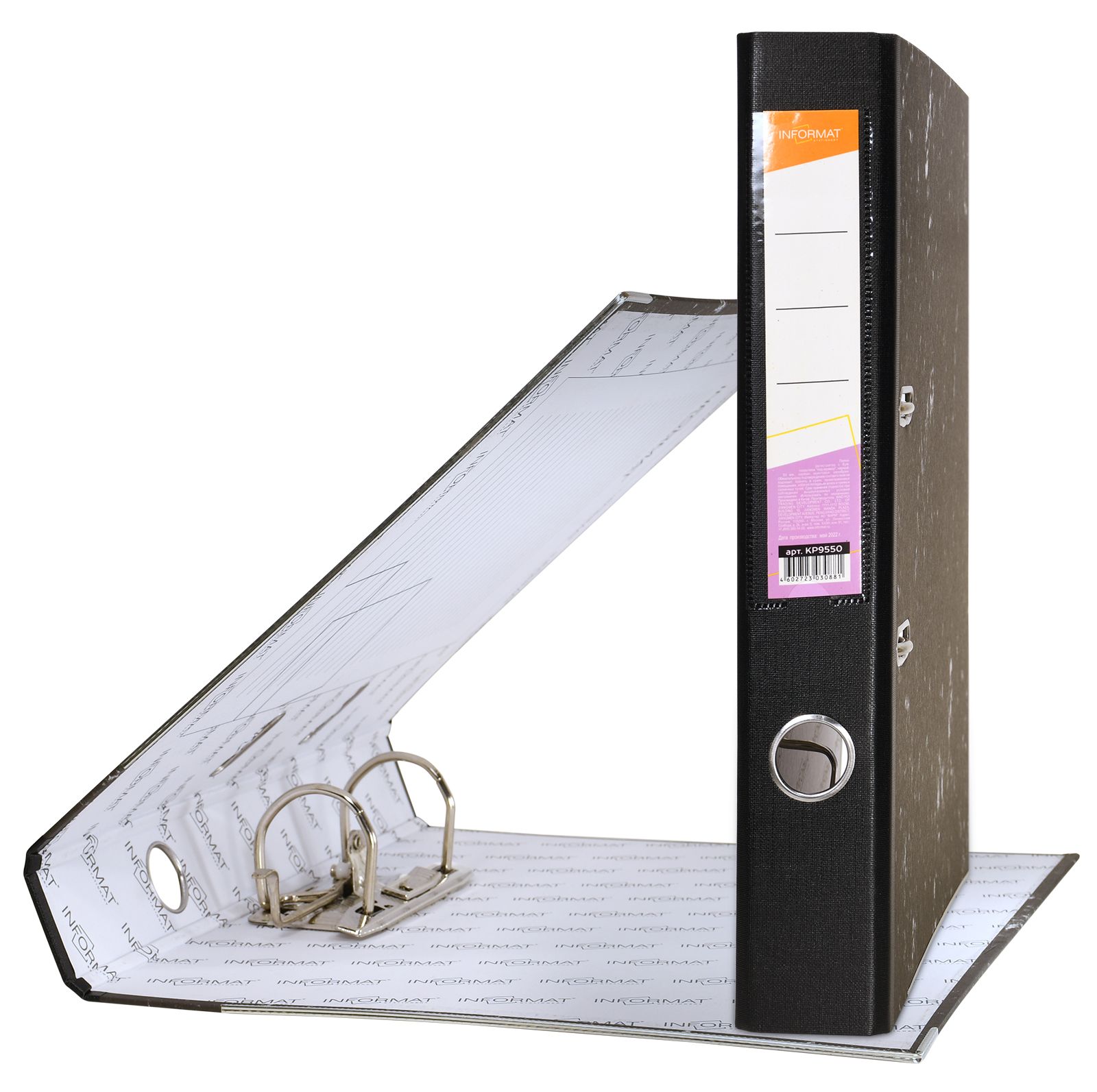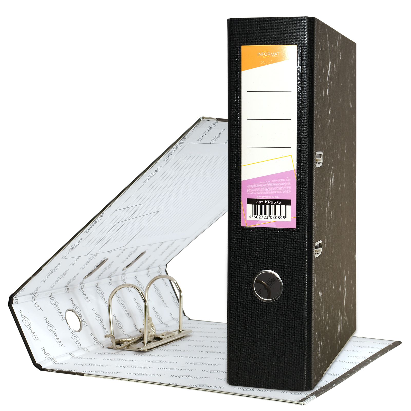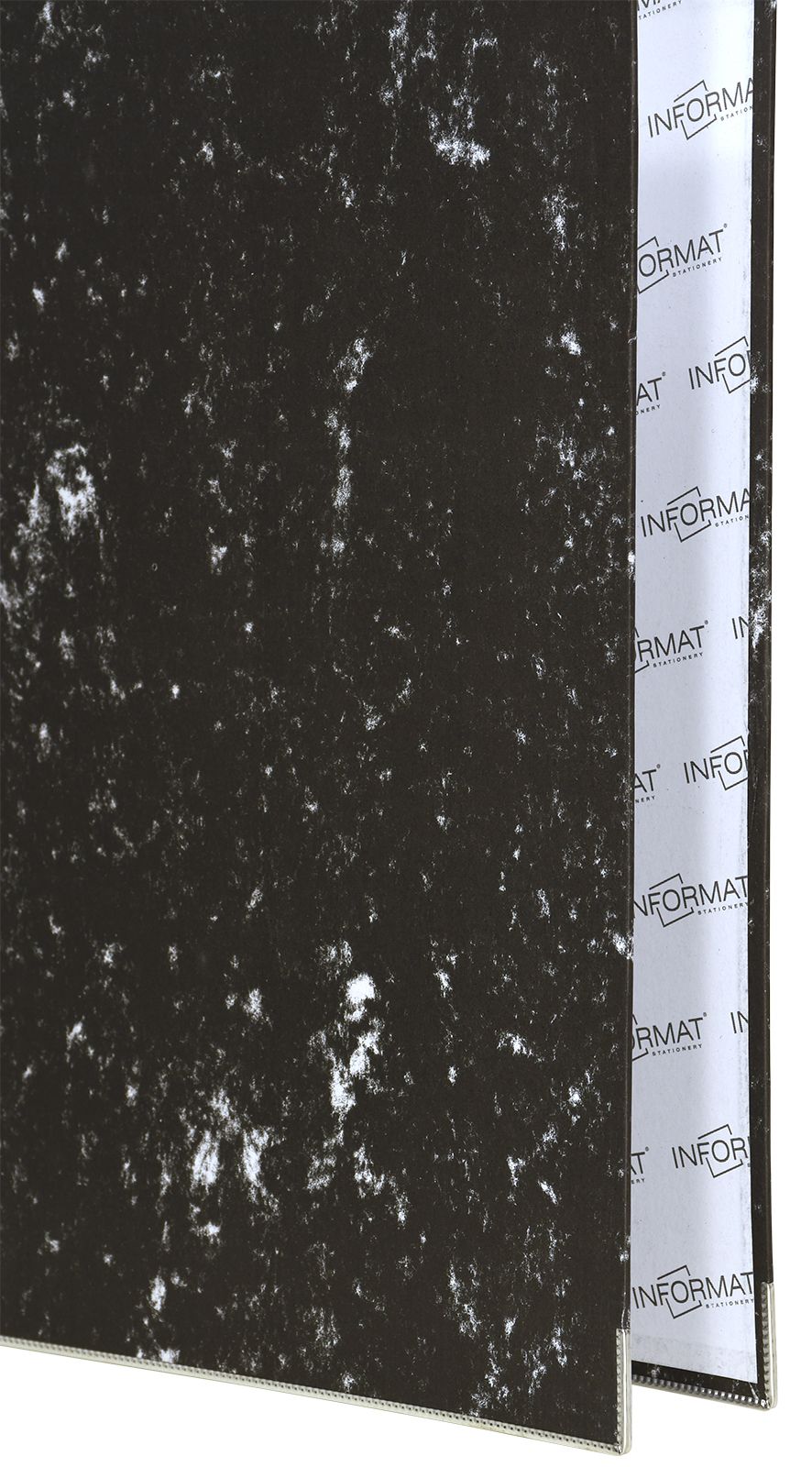 Формат: А4 Цвет: мрамор Ширина, мм: 55 Материал: картон Вместимость листов: 350 Наличие металлической окантовки: Да Мин. партия и варианты упаковок: 1 / 50 Папка-регистратор INFORMAT 55 мм бумага, черный мрамор