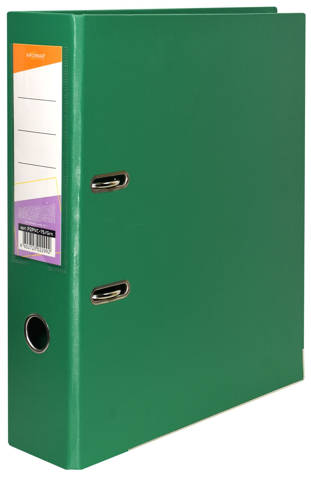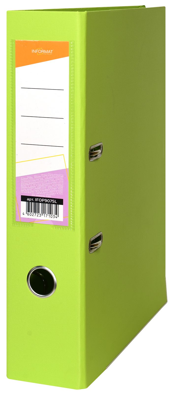 Формат: А4 Цвет: лайм Ширина, мм: 75 Материал: картон Вместимость листов: 480 Наличие металлической окантовки: Да Мин. партия и варианты упаковок: 1 / 50 Папка-регистратор INFORMAT 75 мм двухсторонний PVC, лайм