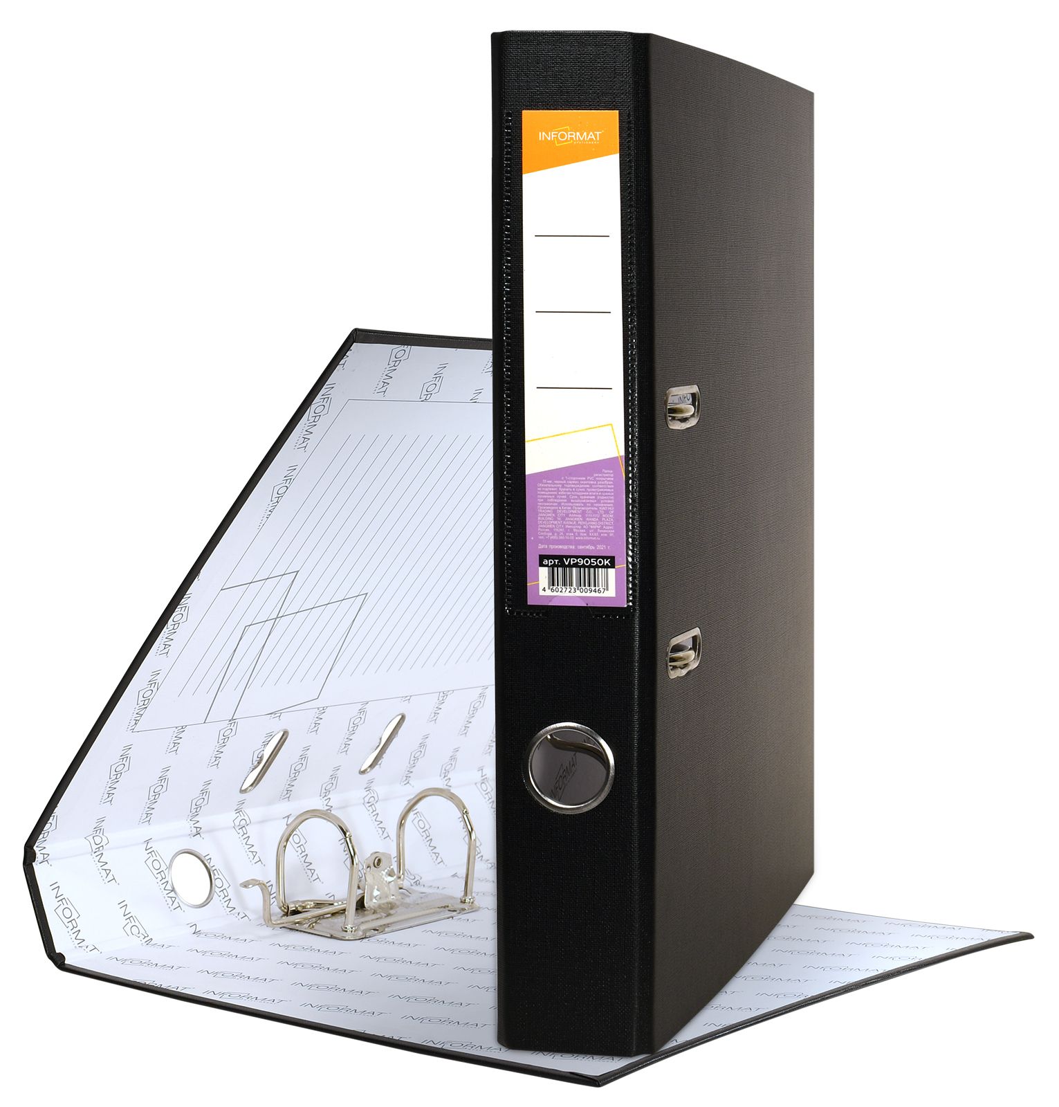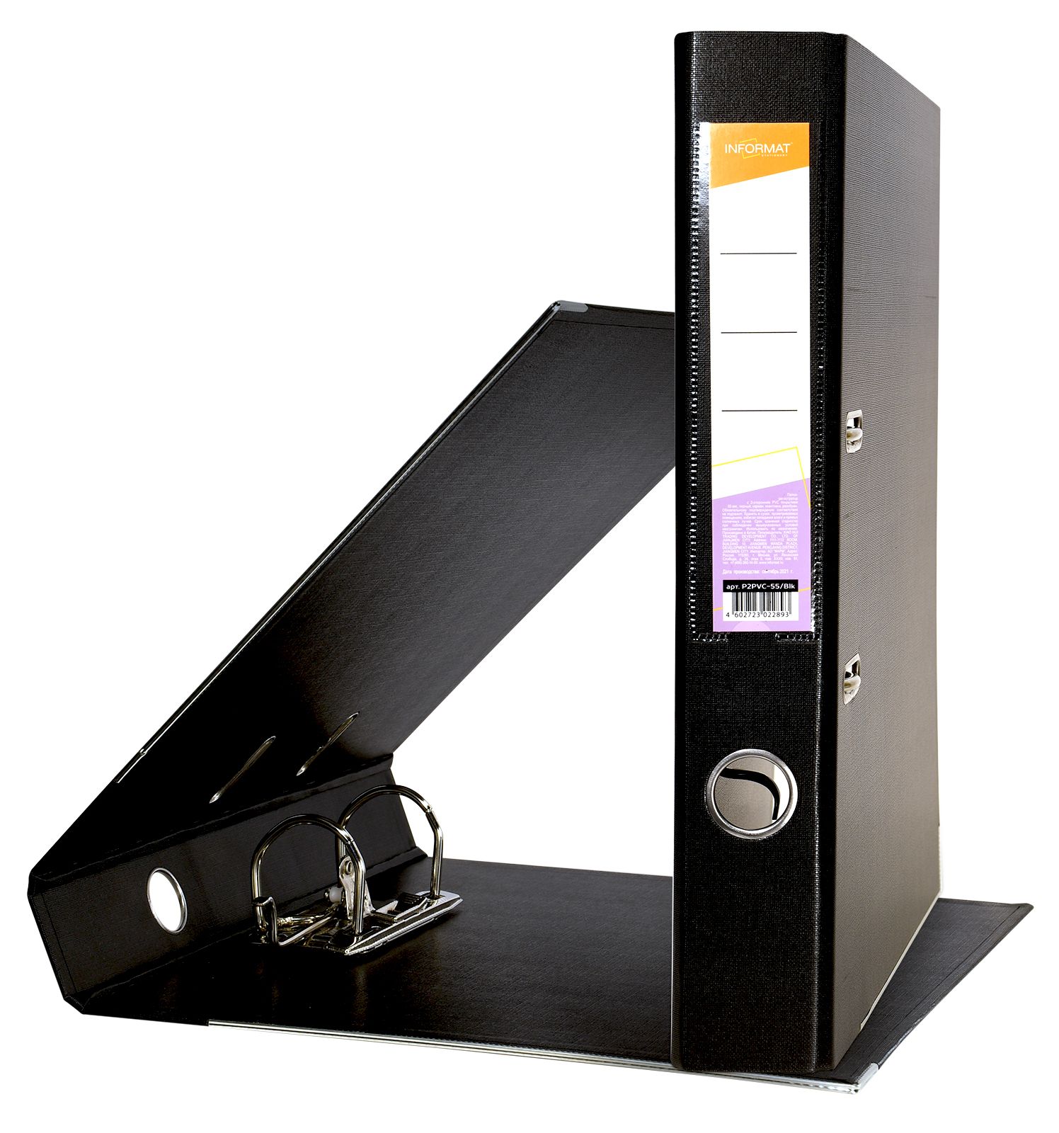 Формат: А4 Цвет: черный Ширина, мм: 55 Материал: картон Вместимость листов: 350 Наличие металлической окантовки: Да Мин. партия и варианты упаковок: 1 / 10 / 50 Папка-регистратор INFORMAT 55 мм двухстороннее покрытие PVC, черная