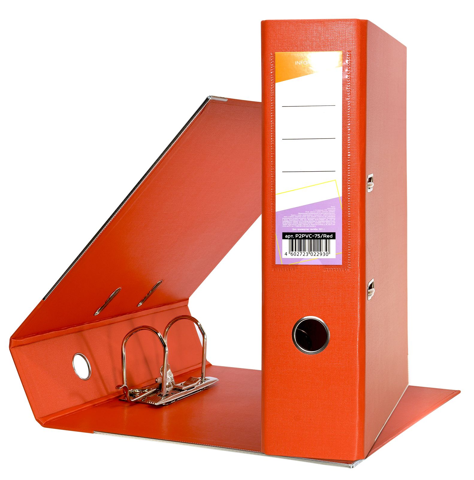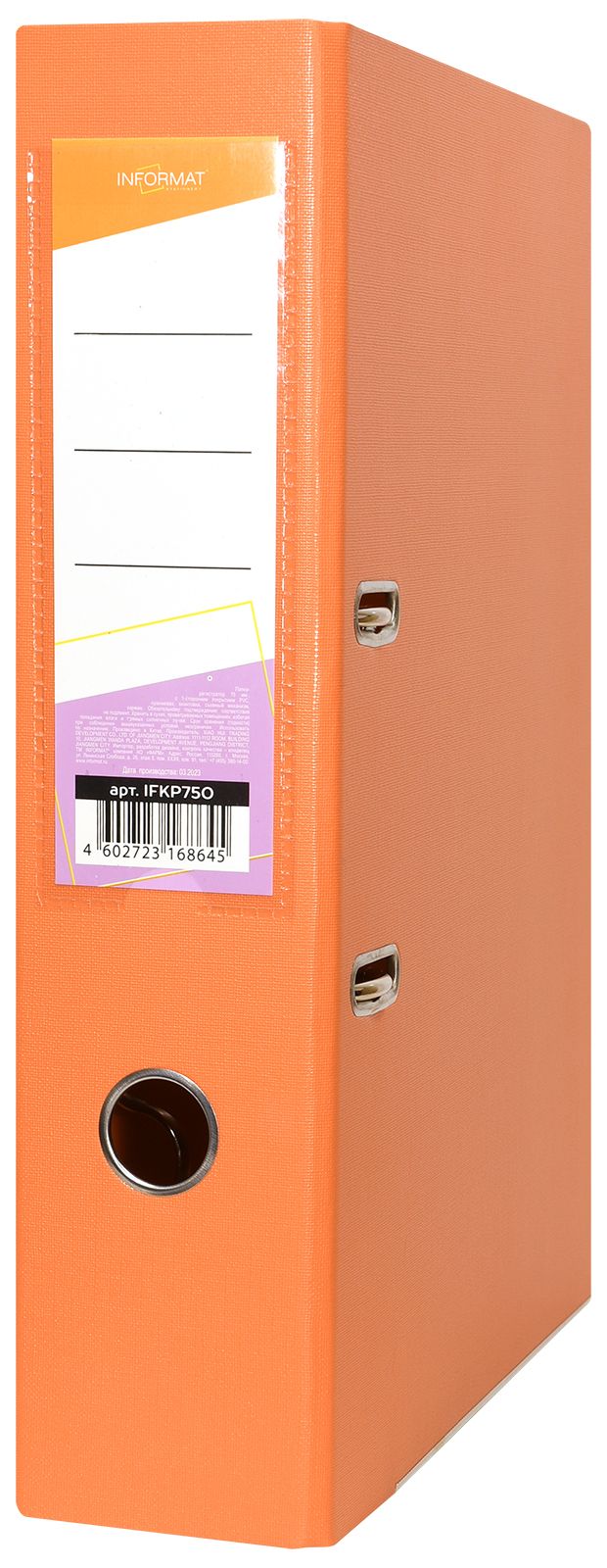 Формат: А4 Цвет: оранжевый Ширина, мм: 75 Материал: картон Вместимость листов: 480 Наличие металлической окантовки: Да Мин. партия и варианты упаковок: 1 / 50 Папка-регистратор INFORMAT 75 мм двухсторонний PVC, оранжевая