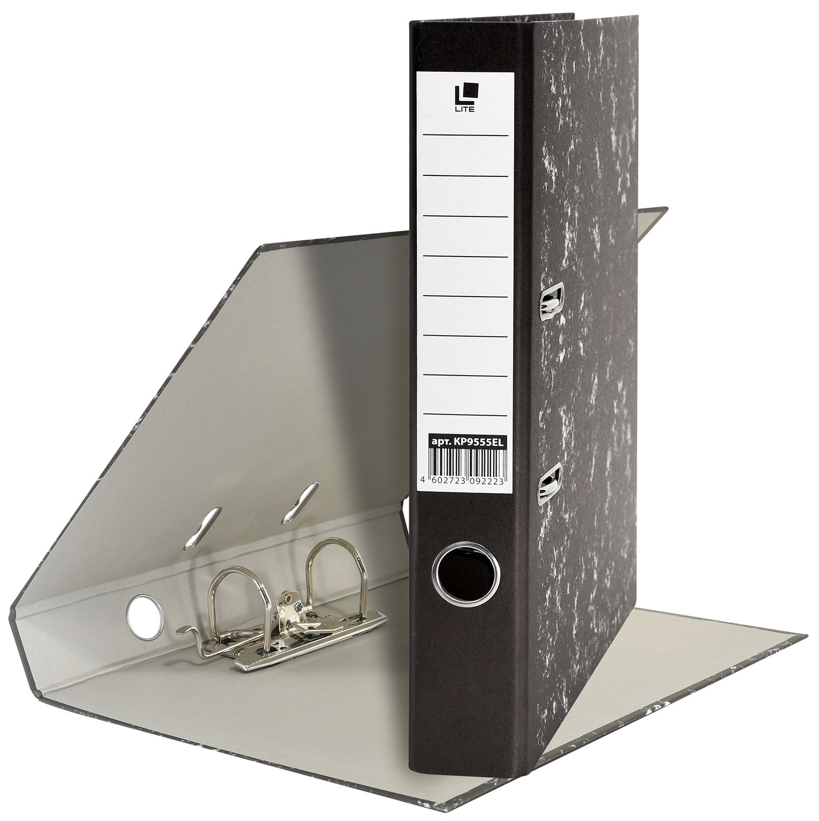 Формат: А4 Цвет: мрамор Ширина, мм: 55 Материал: картон Вместимость листов: 350 Наличие металлической окантовки: Нет Мин. партия и варианты упаковок: 1 / 50 Папка-регистратор LITE 55 мм бумага, черный мрамор