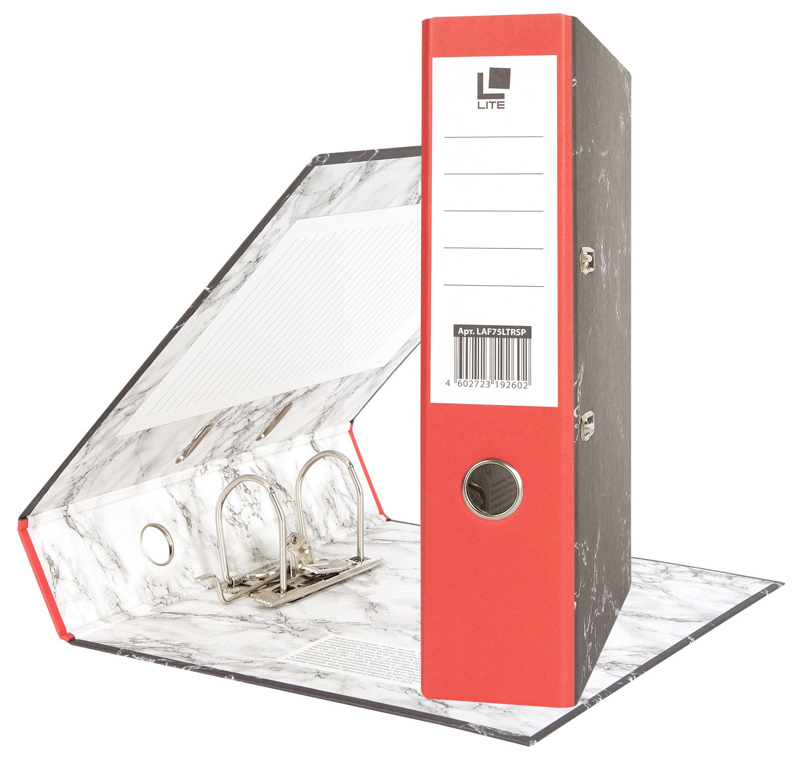Формат: А4 Цвет: мрамор Ширина, мм: 75 Материал: картон Вместимость листов: 500 Наличие металлической окантовки: Нет Мин. партия и варианты упаковок: 1 / 20 Папка-регистратор LITE 75 мм мрамор, корешок красный