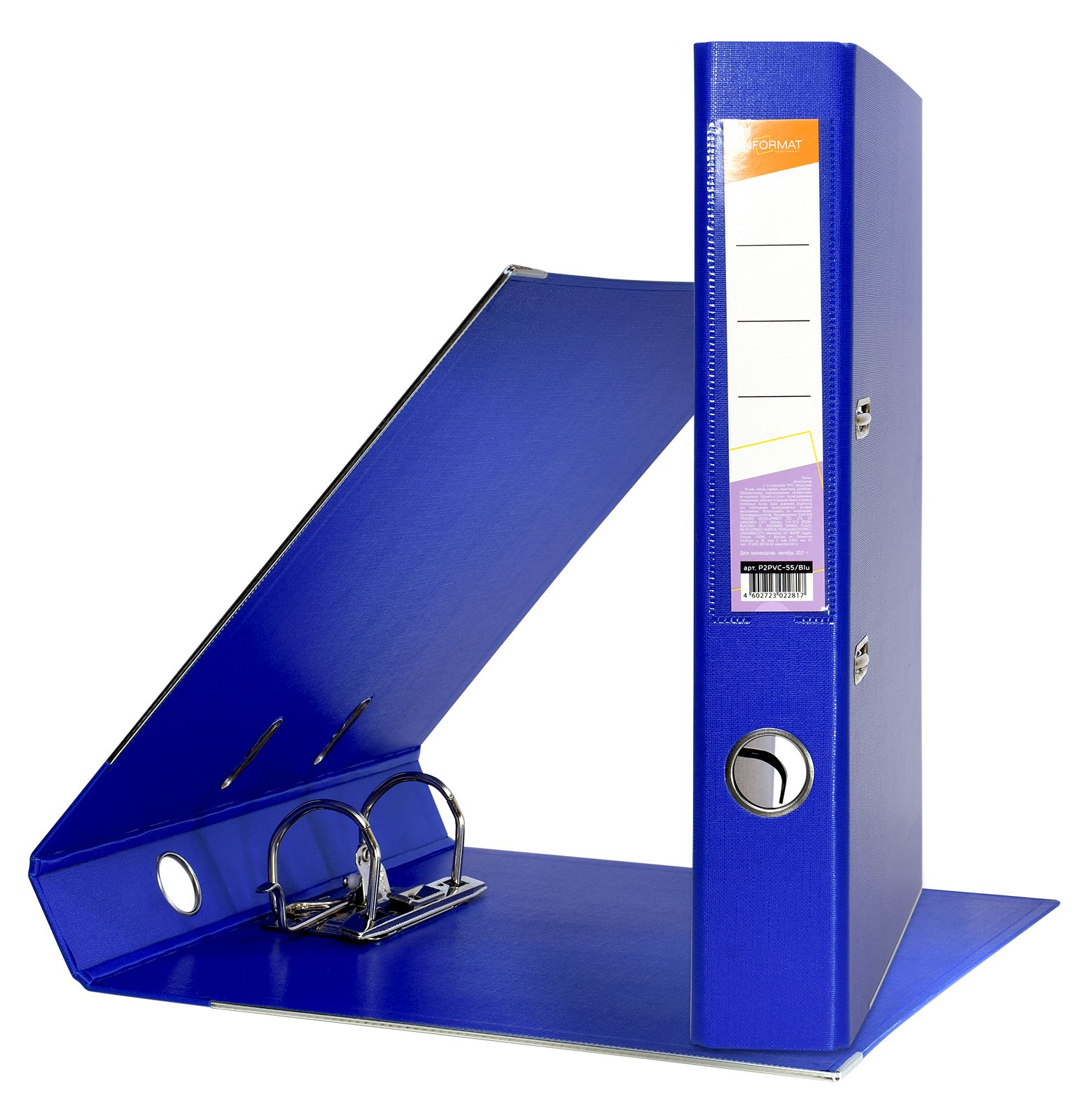 Формат: А4 Цвет: синий Ширина, мм: 55 Материал: картон Вместимость листов: 350 Наличие металлической окантовки: Да Мин. партия и варианты упаковок: 1 / 10 / 50 Папка-регистратор INFORMAT 55 мм двухстороннее покрытие PVC, синяя