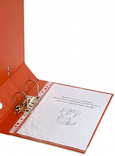 Папка-регистратор формата A4 изготовлена из качественного картона, покрытого с двух сторон покрытием PVC. Нижний край папки защищен металлическим кантом, предохраняющим ее от износа. Металлический арочный механизм съемный. На корешке папки имеется карман со сменной этикеткой для маркировки и кольцо для удобства захвата. Прорези на крышке папки удерживают ее, даже при большом количестве документов.