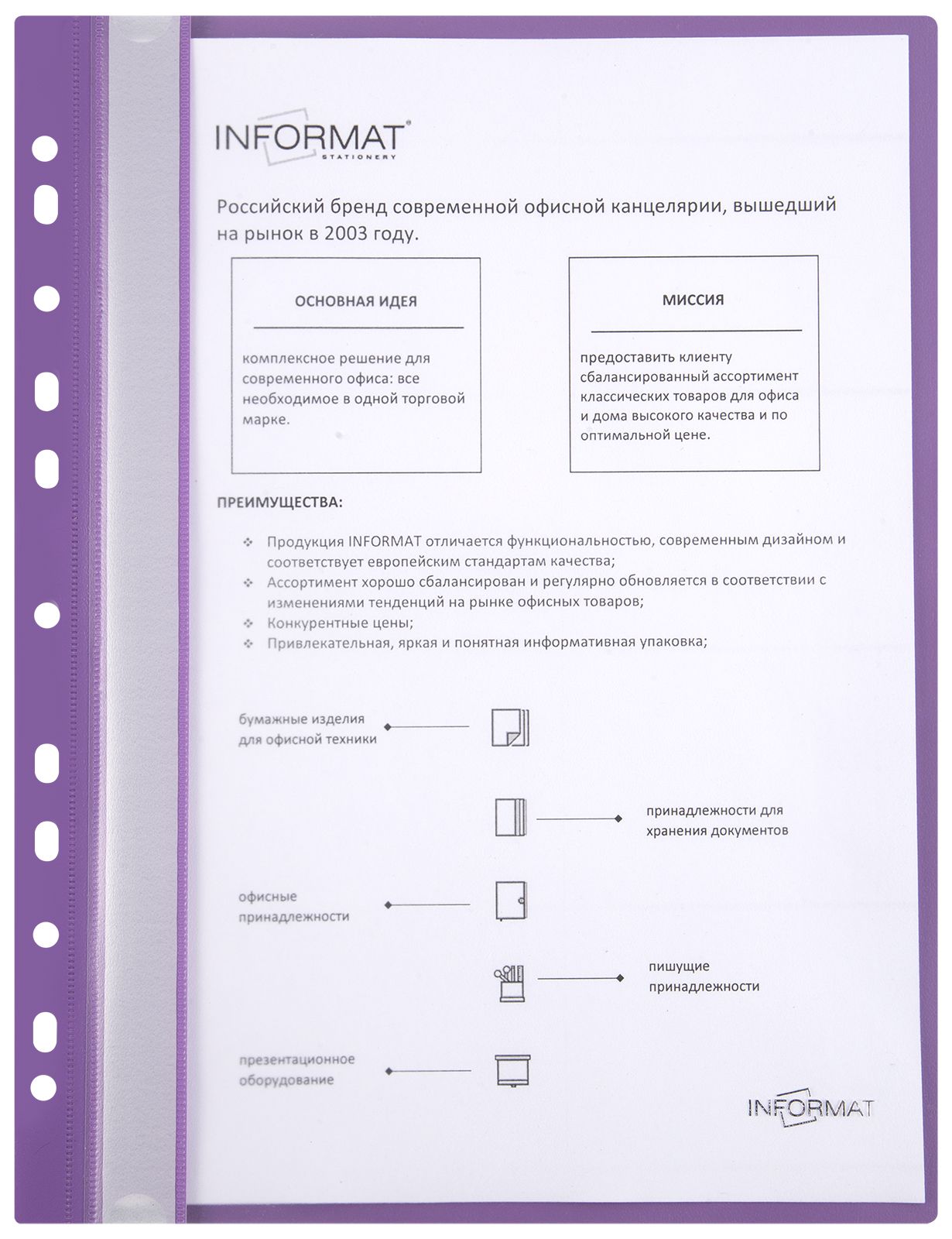 Формат: А4 Цвет: фиолетовый Наличие перфорации: Да Ширина, мм: 230 Высота, мм: 310 Материал: пластик Мин. партия и варианты упаковок: 1 / 25 / 400 -