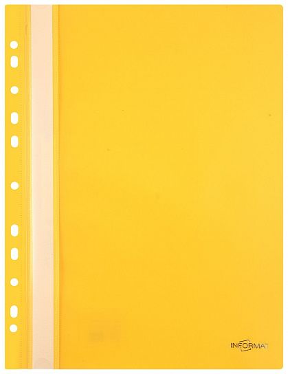 Формат: А4 Цвет: желтый Наличие перфорации: Да Ширина, мм: 230 Высота, мм: 310 Материал: пластик Мин. партия и варианты упаковок: 1 / 25 / 400 Папка скоросшиватель INFORMAT А4 желтая, пластик 180 мкм, карман для маркировки, с перфорацией