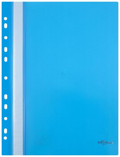 Формат: А4 Цвет: голубой Наличие перфорации: Да Ширина, мм: 230 Высота, мм: 310 Материал: пластик Мин. партия и варианты упаковок: 1 / 25 / 400 Папка скоросшиватель INFORMAT А4 голубая, пластик 180 мкм, карман для маркировки, с перфорацией