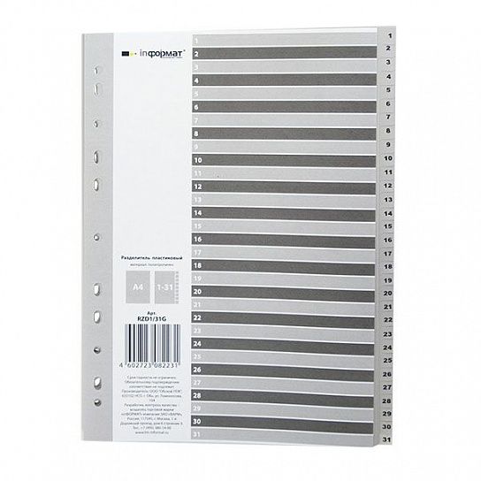 Формат: А4 Материал: пластик Тип разделителя: 1-31 дней Мин. партия и варианты упаковок: 1 / 10 / 60 -