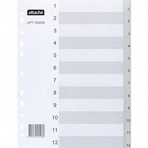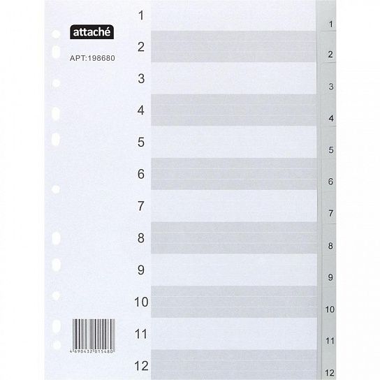 Формат: А4 Цвет: серый Наличие титульного листа: Да Материал: пластик Тип разделителя: 1-12 цифры Количество цветов: 1 Мин. партия и варианты упаковок: 1 / 150 -