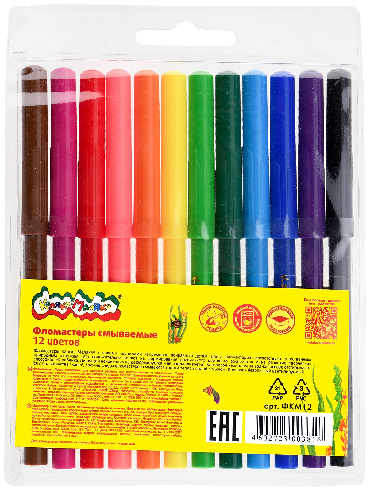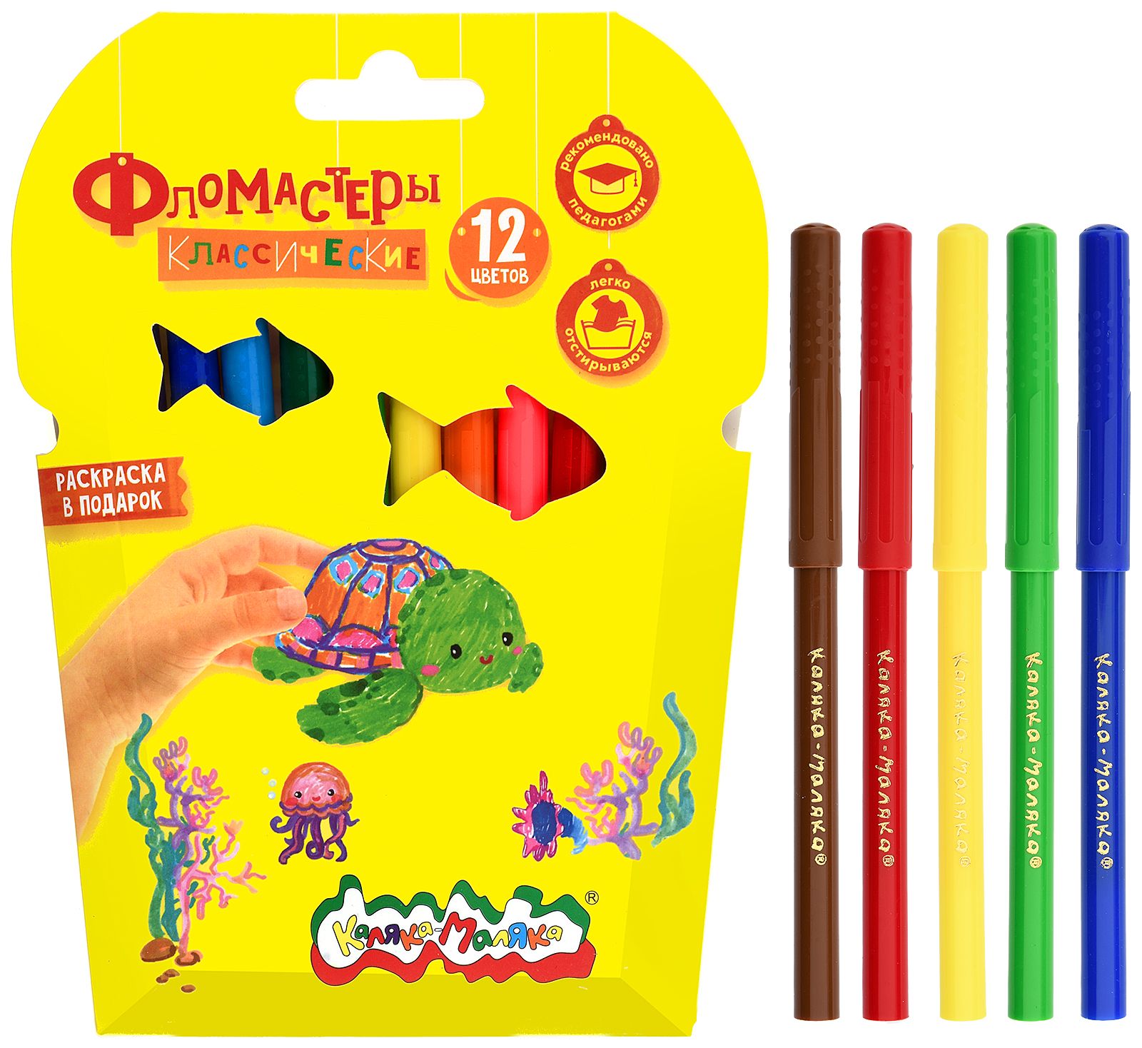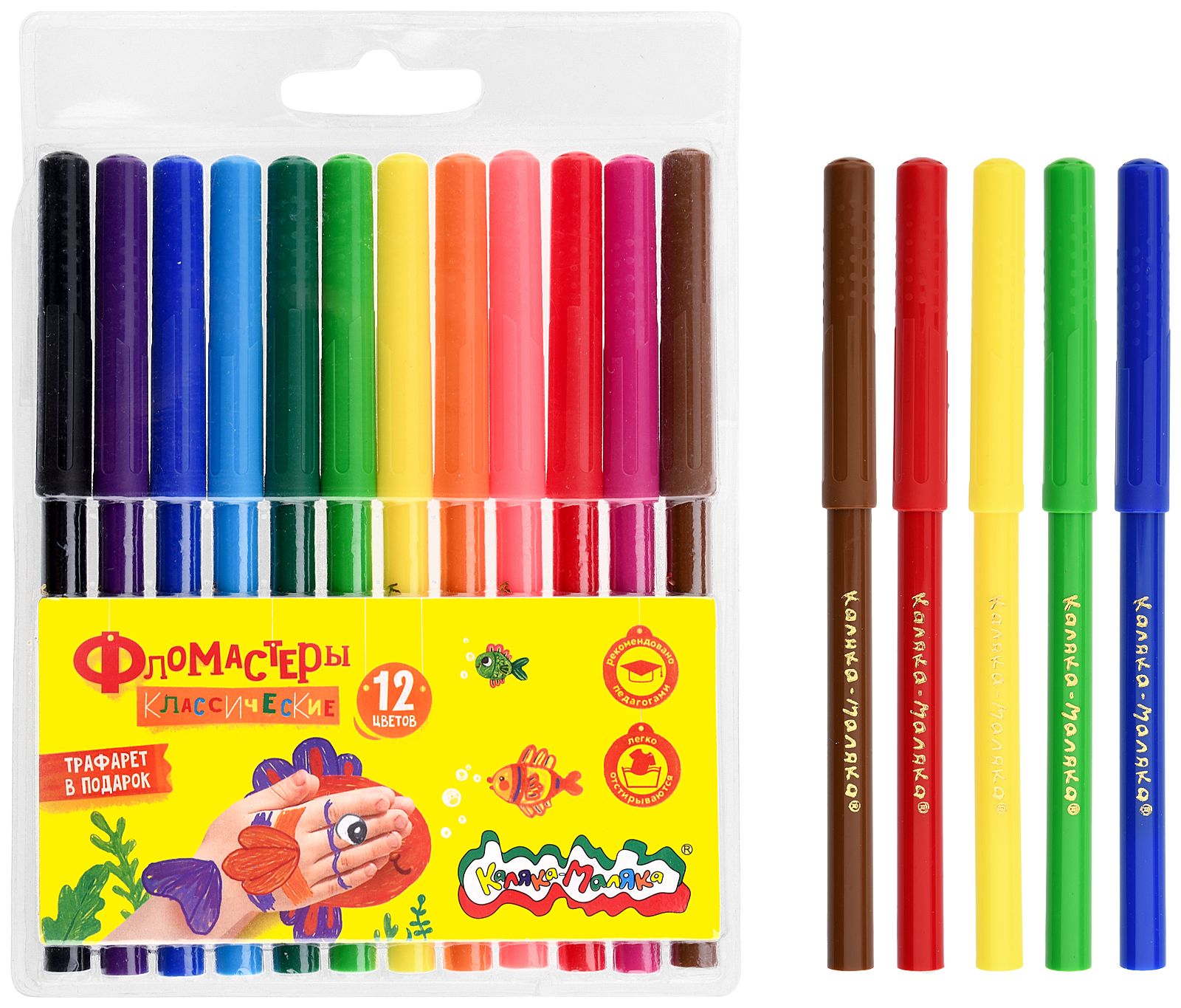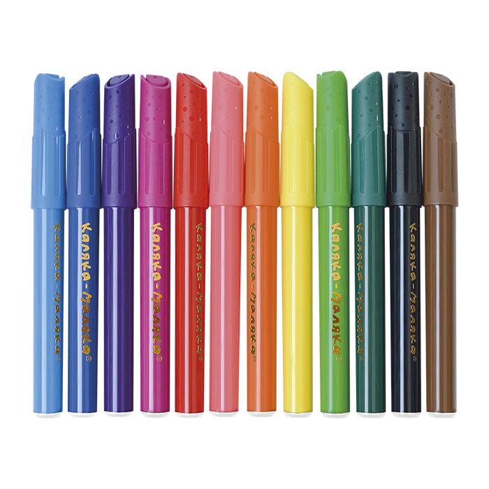 Количество цветов: 12 Наличие европодвеса: Да Форма наконечника: конический Тип фломастеров: классические Вид товара: Фломастеры Возраст: от 3 лет Мин. партия и варианты упаковок: 1 / 12 / 96 Фломастеры Каляка-Маляка утолщенные классические 12 цв. круглый корпус, легкосмываемые, блистер