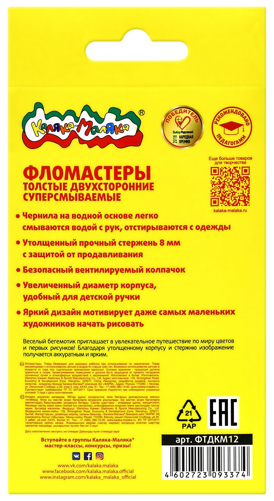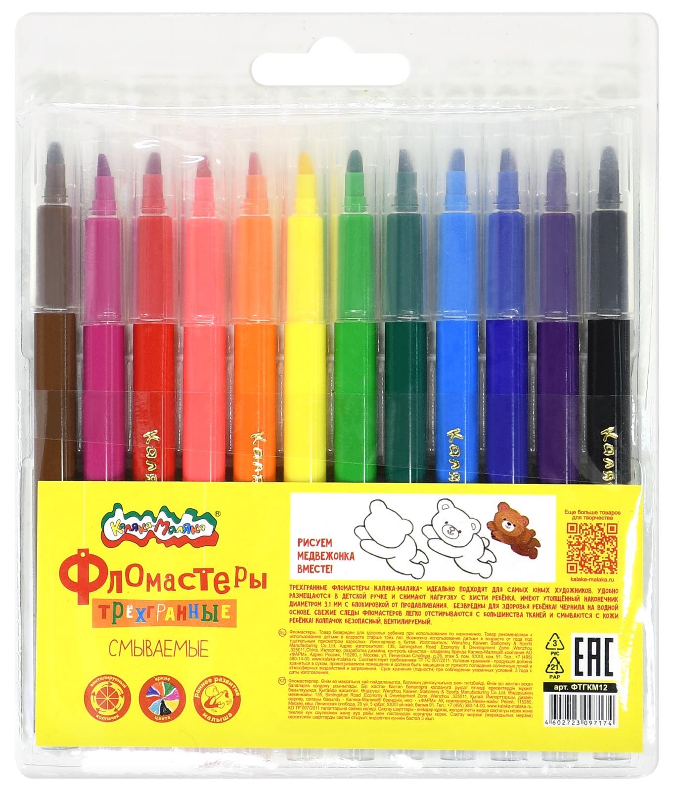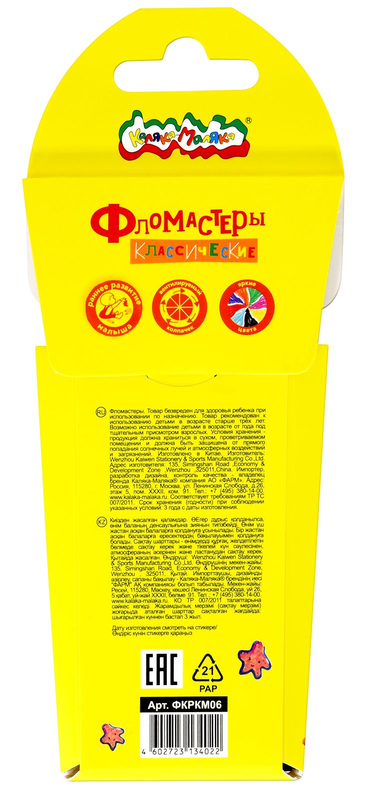 Количество цветов: 12 Наличие европодвеса: Да Форма наконечника: конический Тип фломастеров: классические Вид товара: Фломастеры Возраст: от 3 лет Мин. партия и варианты упаковок: 1 / 12 / 96 Фломастеры Каляка-Маляка утолщенные классические 12 цв. круглый корпус, легкосмываемые, блистер