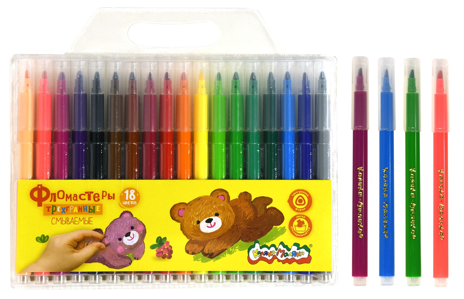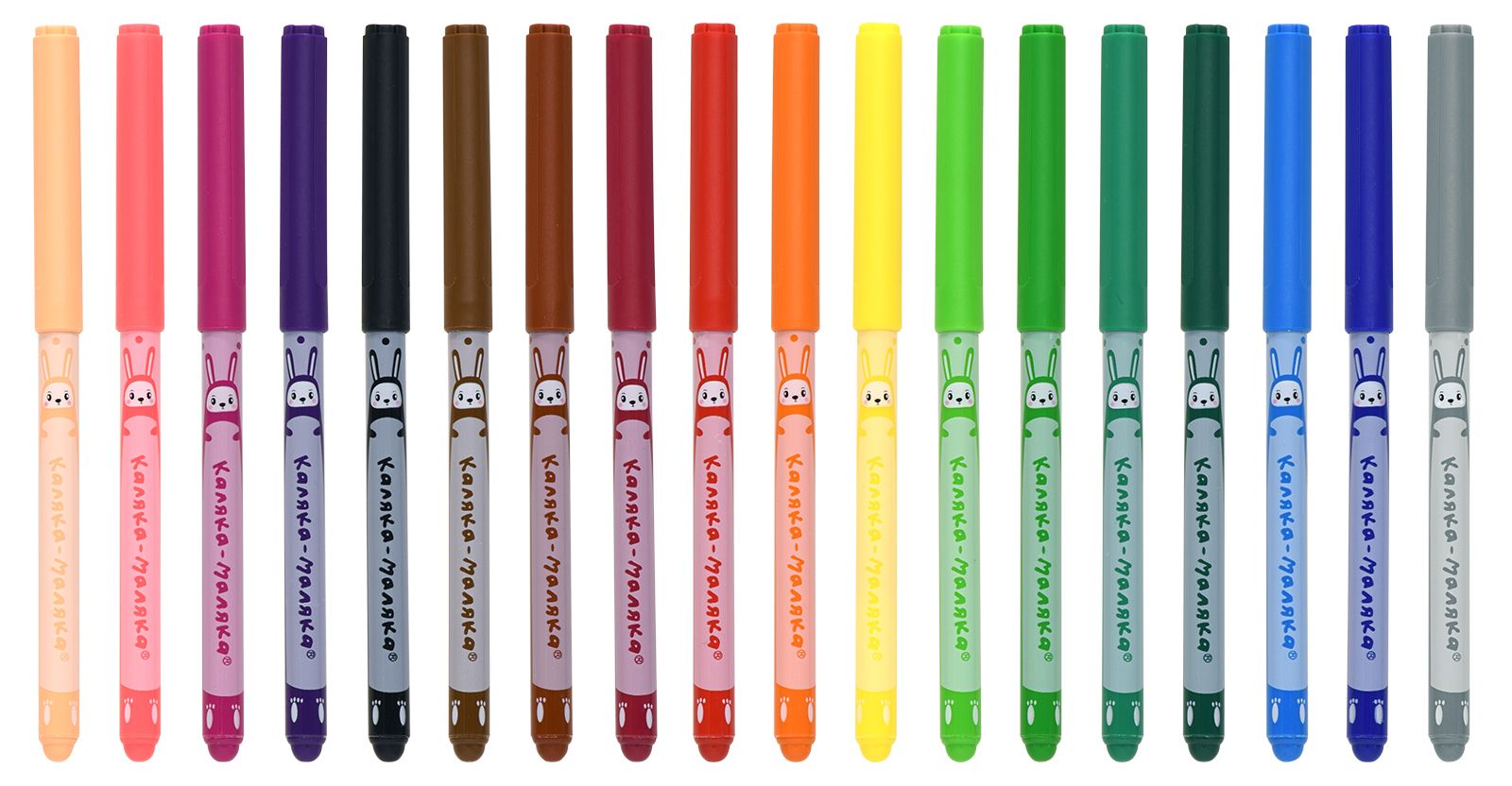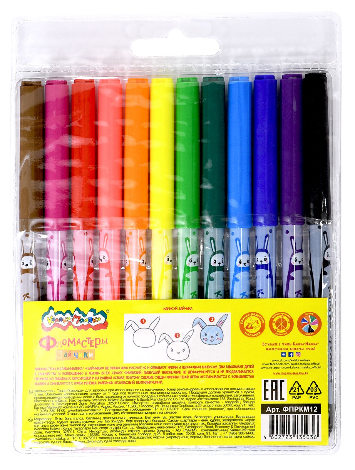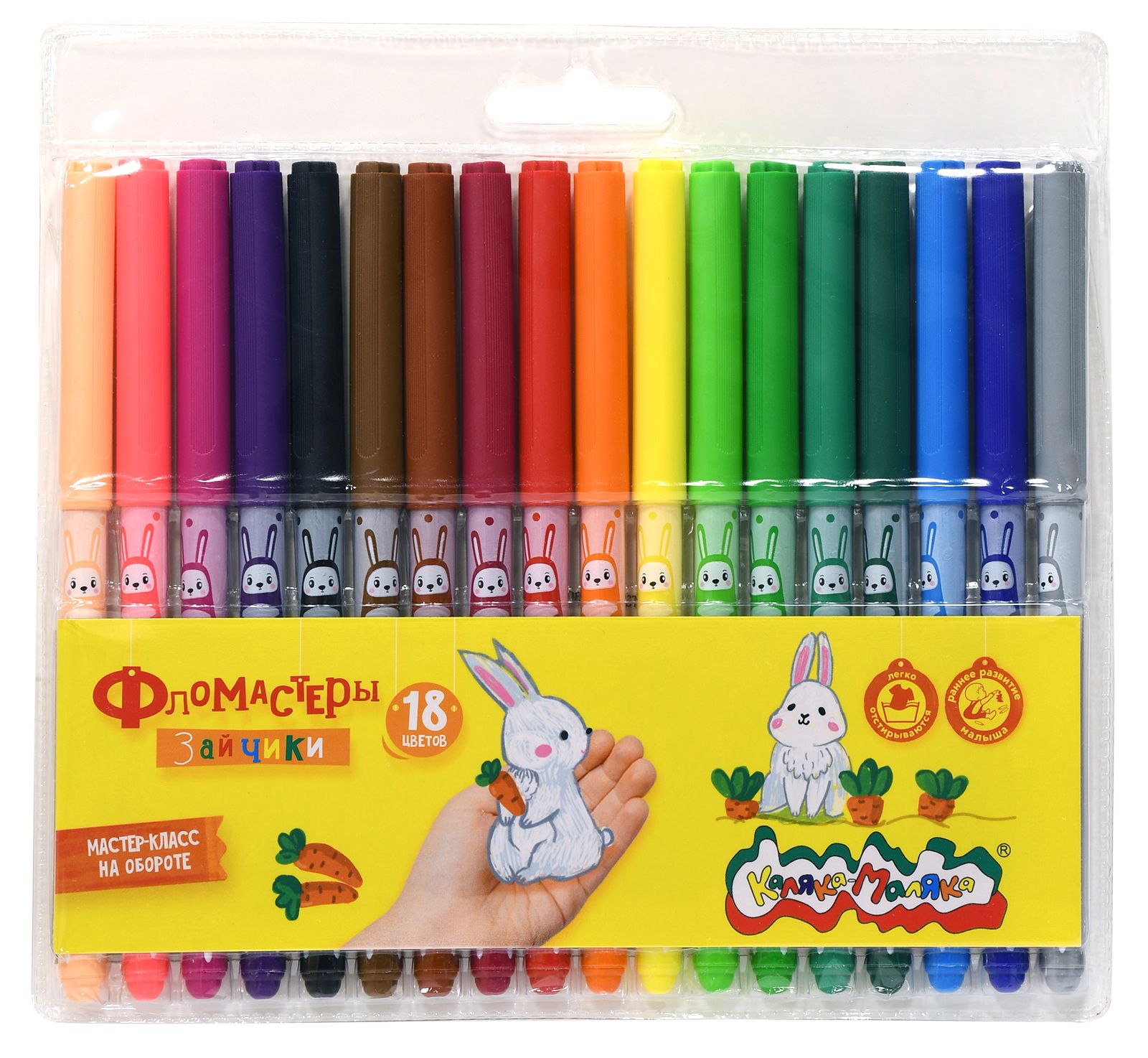 Количество цветов: 18 Наличие европодвеса: Да Форма наконечника: пулевидный Тип фломастеров: классические Вид товара: Фломастеры Возраст: от 3 лет Мин. партия и варианты упаковок: 1 / 12 / 144 Фломастеры Каляка-Маляка ЗАЙЧИКИ классические 18 цв. круглый корпус, легкосмываемые, принт на корпусе, блистер