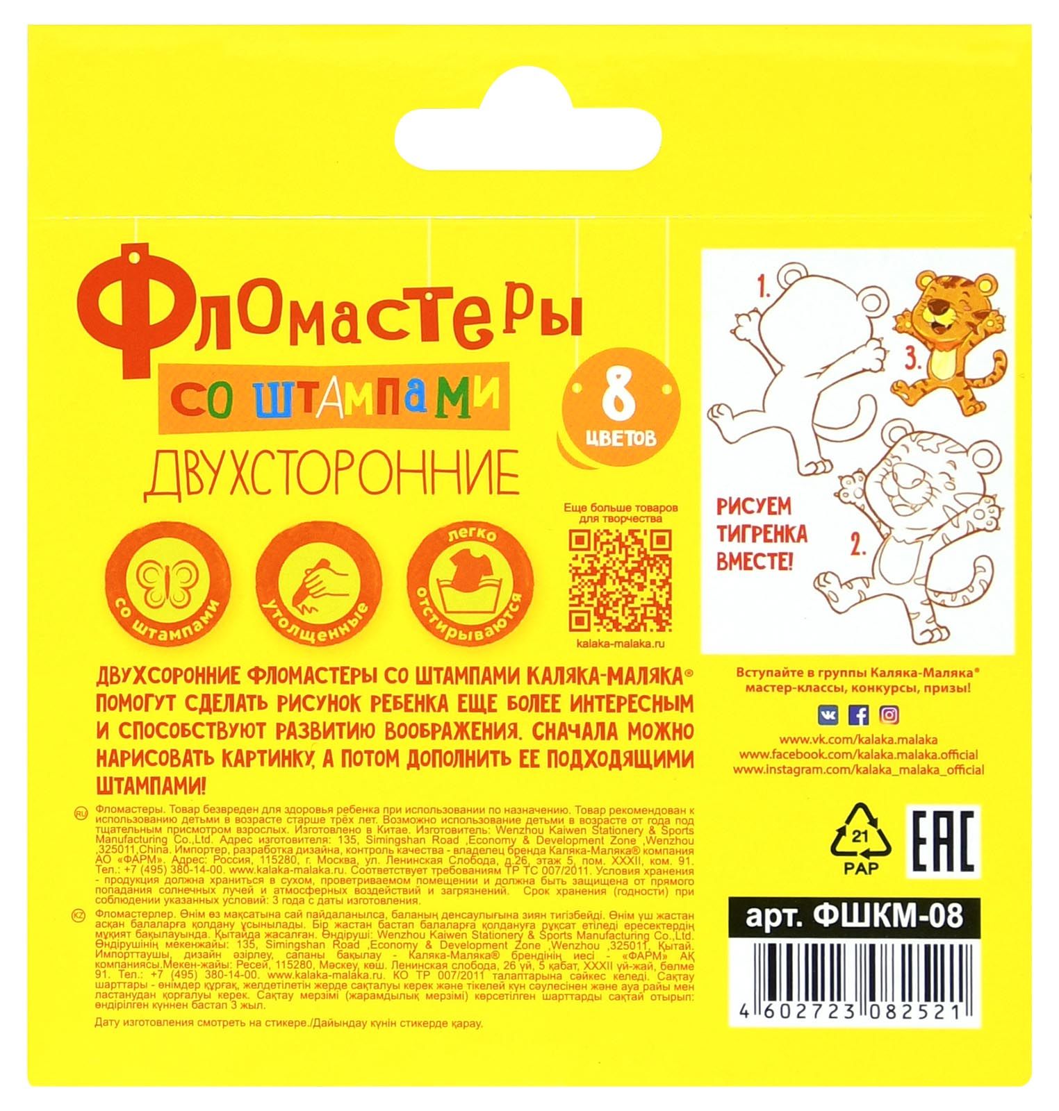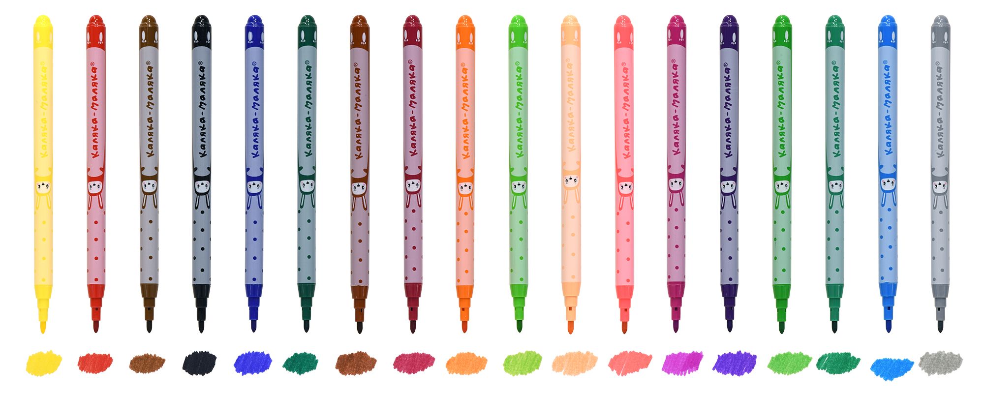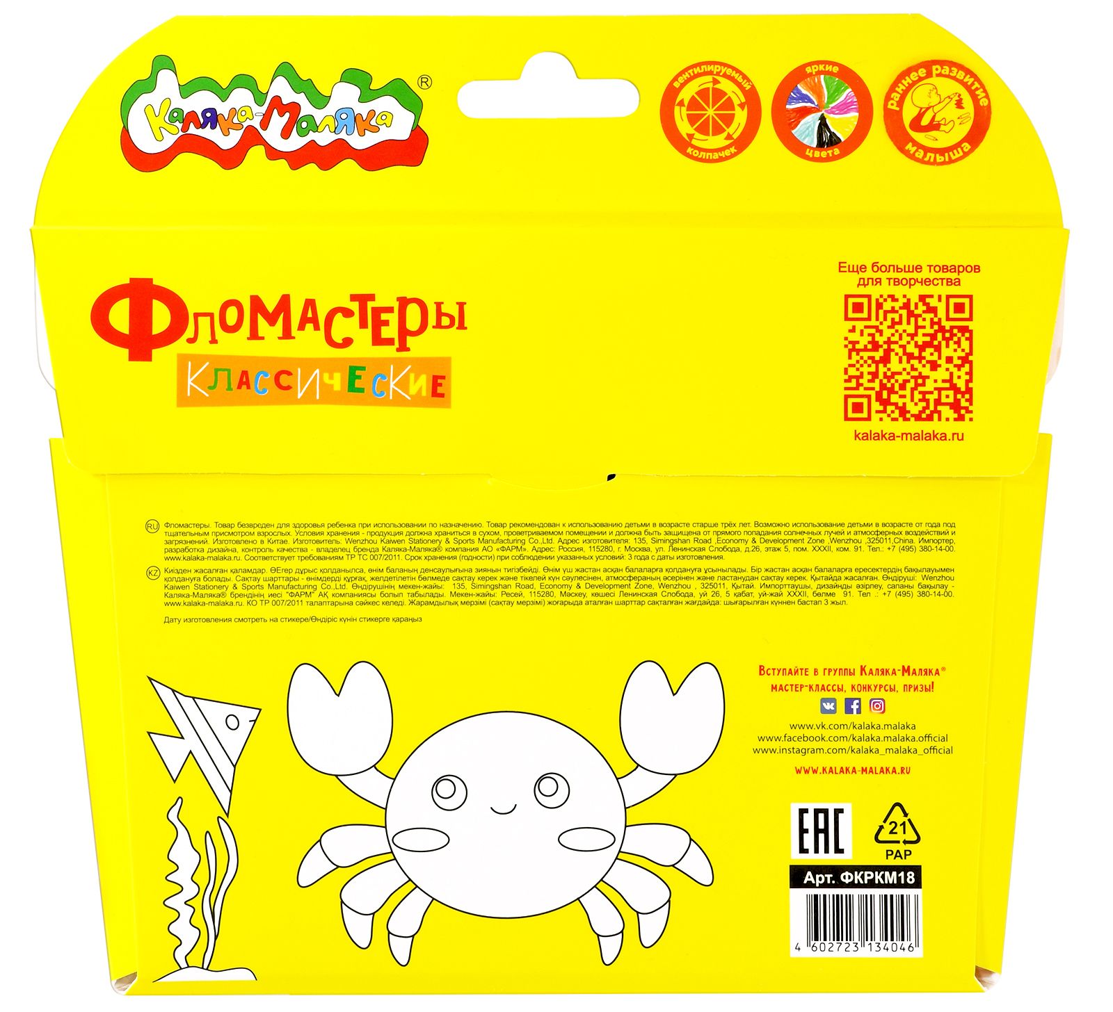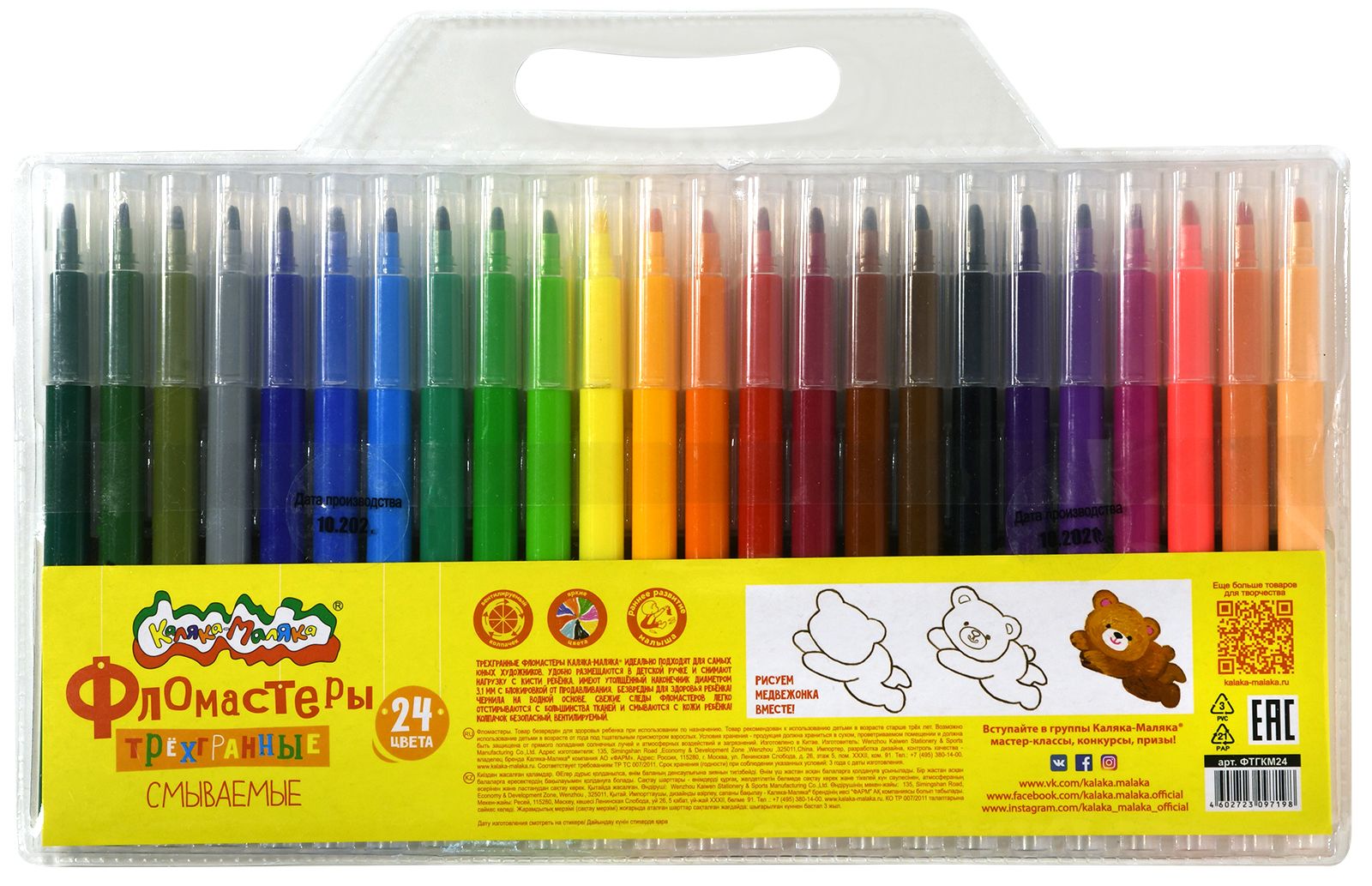 Количество цветов: 18 Наличие европодвеса: Да Форма наконечника: пулевидный Тип фломастеров: классические Вид товара: Фломастеры Возраст: от 3 лет Мин. партия и варианты упаковок: 1 / 12 / 144 Фломастеры Каляка-Маляка ЗАЙЧИКИ классические 18 цв. круглый корпус, легкосмываемые, принт на корпусе, блистер
