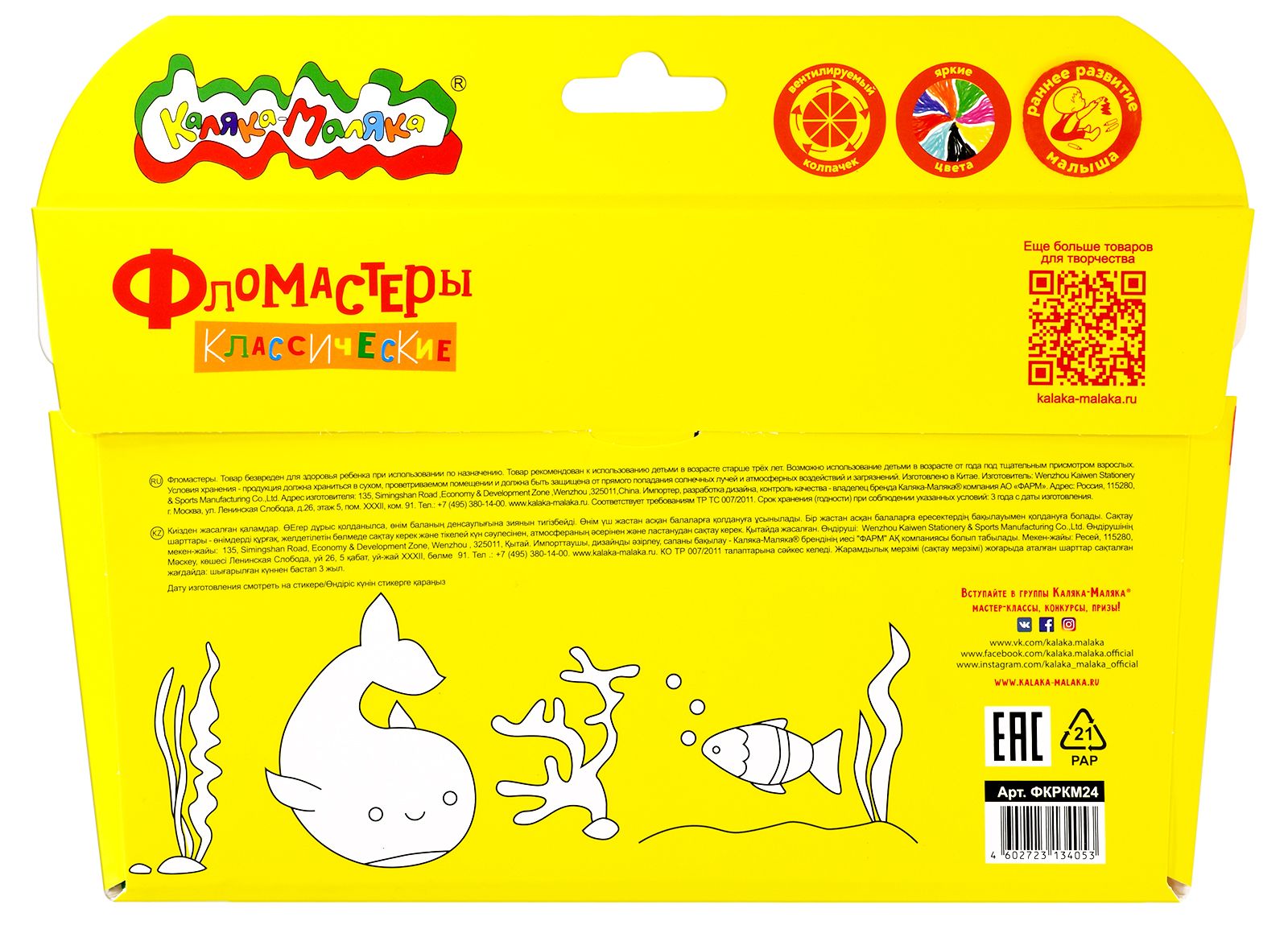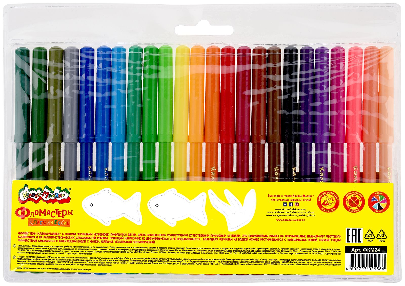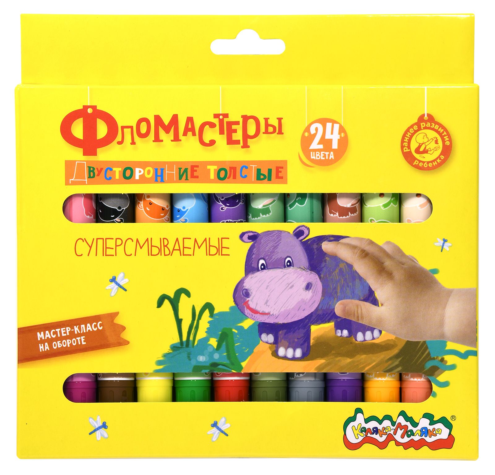 Количество цветов: 24 Наличие европодвеса: Да Форма наконечника: конический Тип фломастеров: классические Вид товара: Фломастеры Возраст: от 3 лет Мин. партия и варианты упаковок: 1 / 12 / 72 Фломастеры Каляка-Маляка утолщенные классические 24 цв. круглый корпус, суперсмываемые, двухсторонние, принт на корпусе, картонная упаковка