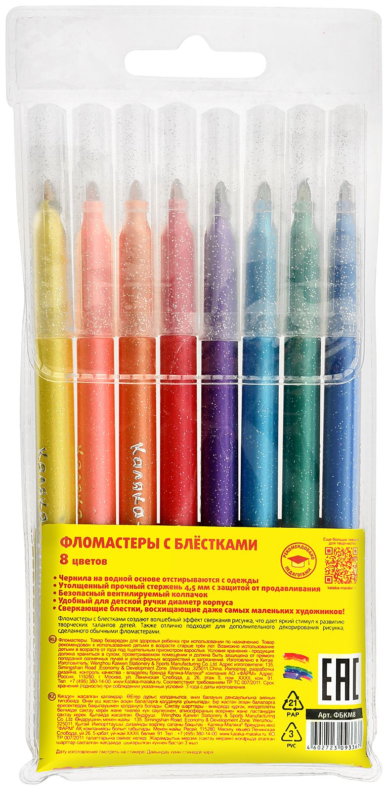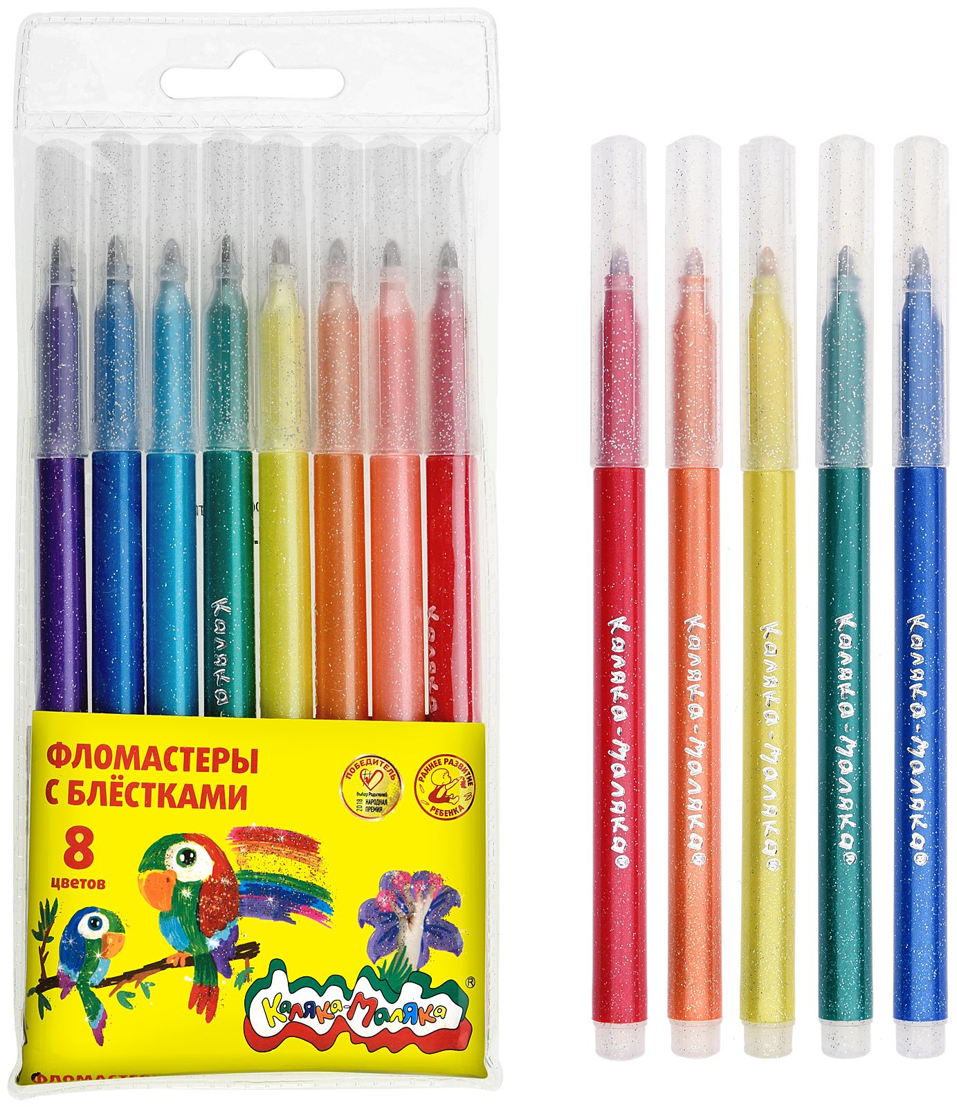 Количество цветов: 8 Наличие европодвеса: Да Форма наконечника: конический Тип фломастеров: с блёстками Вид товара: Фломастеры Возраст: от 3 лет Мин. партия и варианты упаковок: 1 / 24 / 192 Фломастеры Каляка-Маляка с блёстками 8 цв. круглый корпус, легкосмываемые, блистер