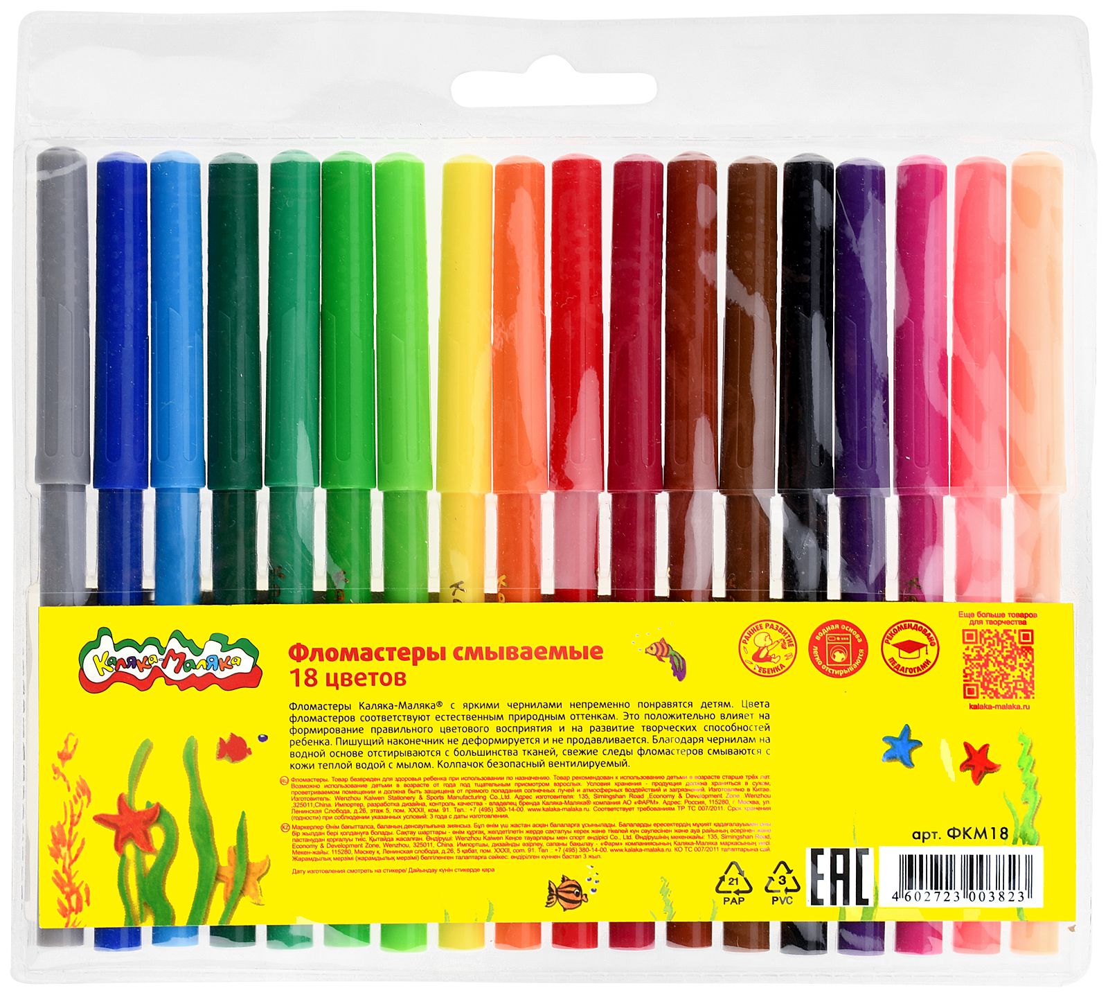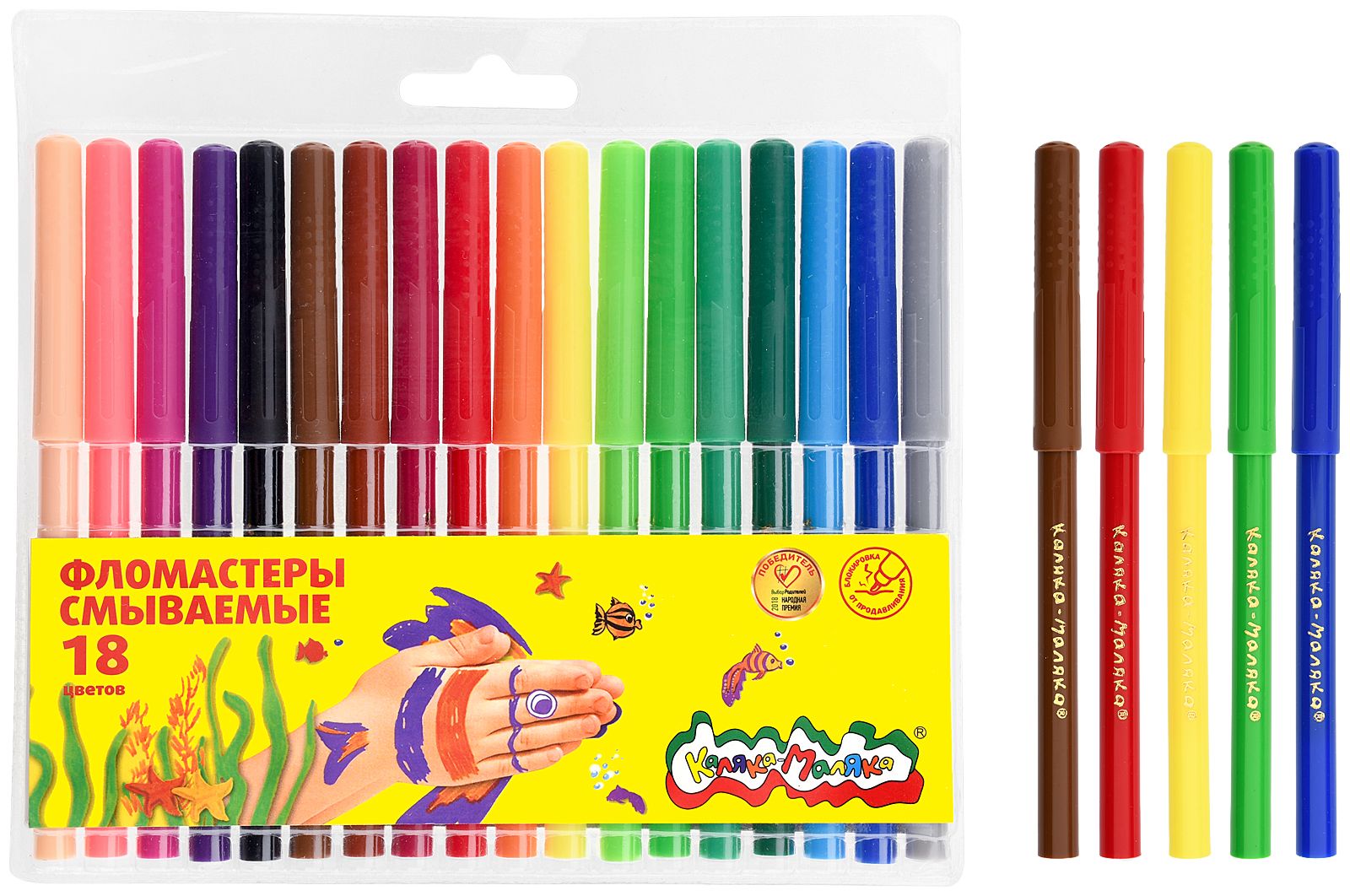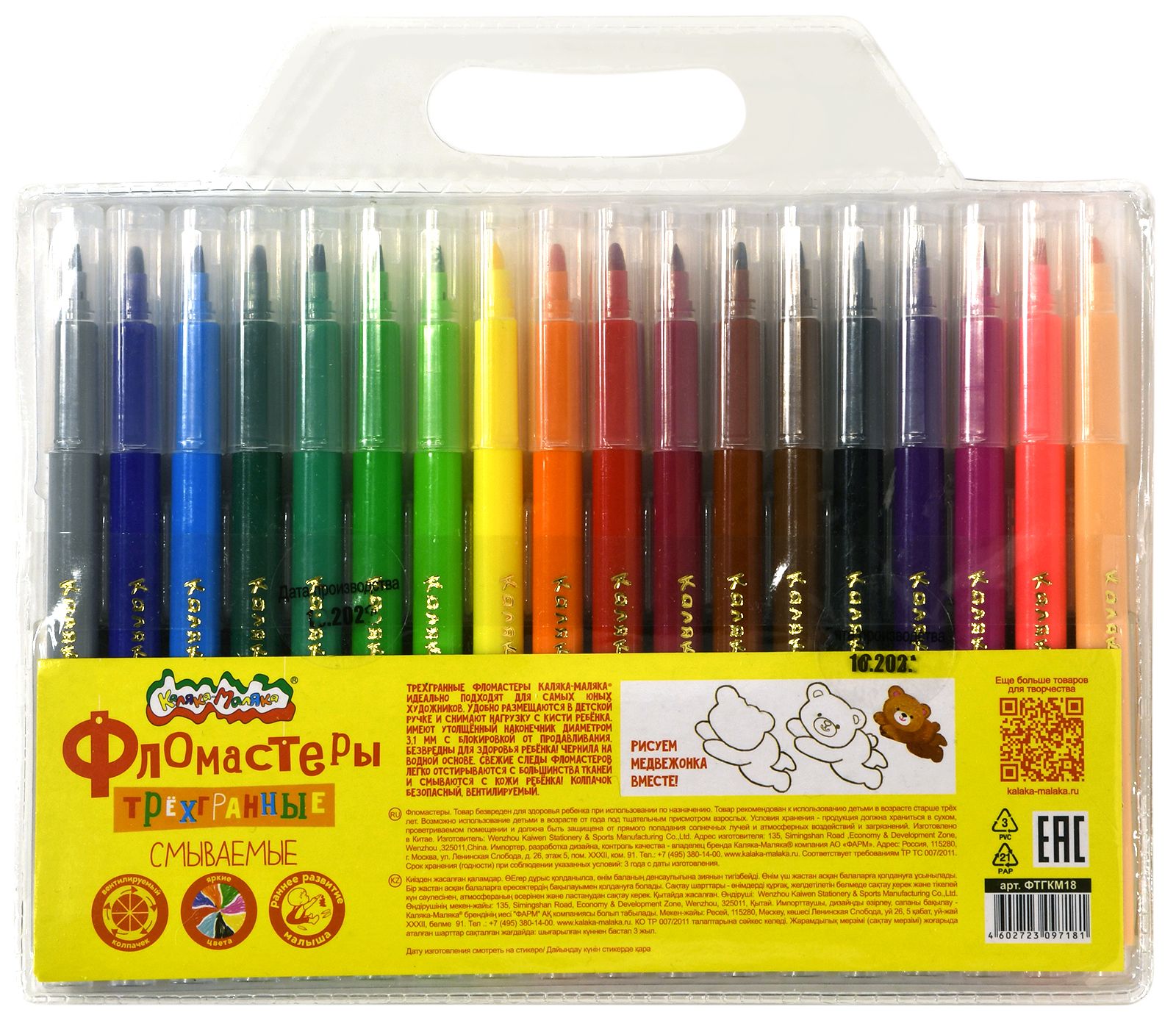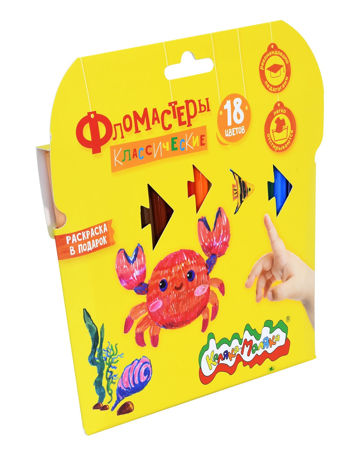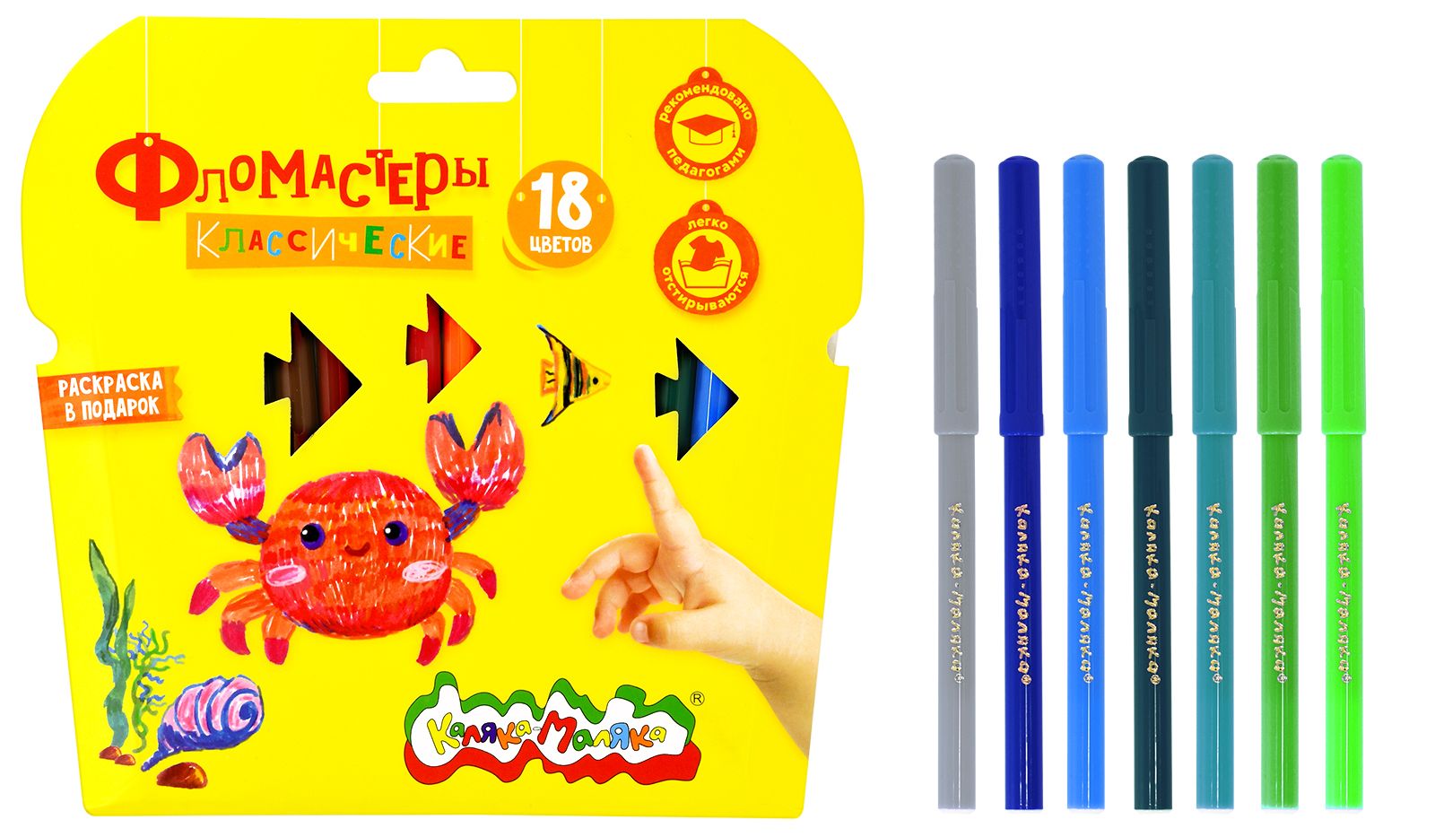Количество цветов: 18 Наличие европодвеса: Да Форма наконечника: пулевидный Тип фломастеров: классические Вид товара: Фломастеры Возраст: от 3 лет Мин. партия и варианты упаковок: 1 / 12 / 144 Фломастеры Каляка-Маляка классические 18 цв. круглый корпус, легкосмываемые, блистер