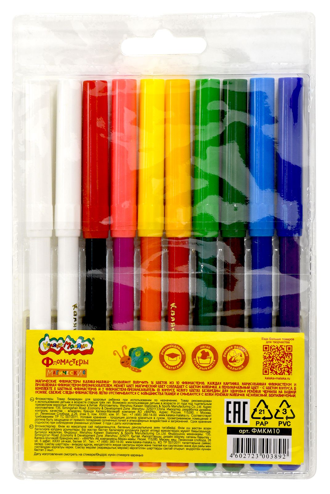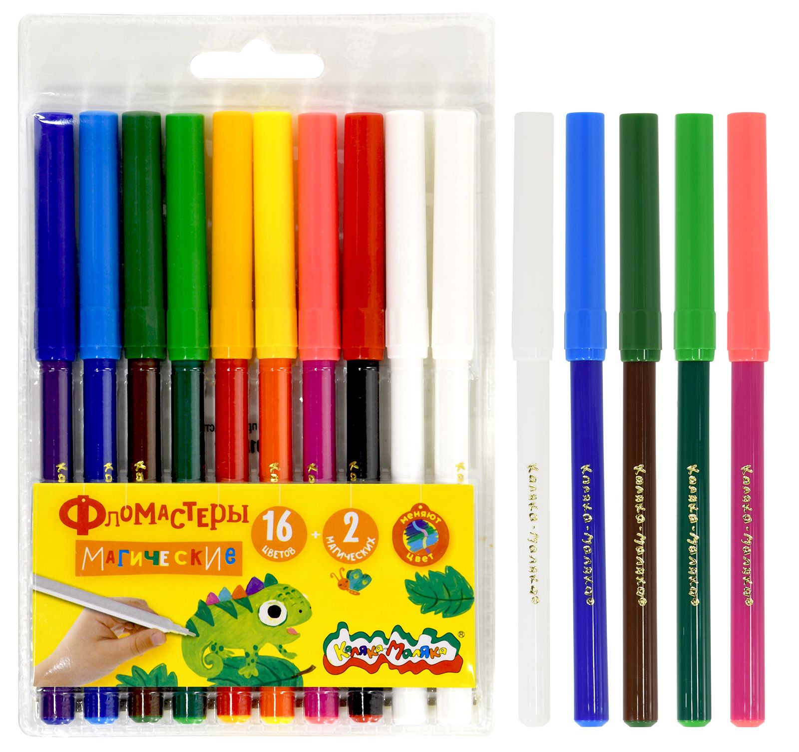 Количество цветов: 16 Наличие европодвеса: Да Форма наконечника: пулевидный Тип фломастеров: магические Вид товара: Фломастеры Возраст: от 3 лет Мин. партия и варианты упаковок: 1 / 12 / 240 Фломастеры Каляка-Маляка МАГИЧЕСКИЕ 16 цв. + 2 фломастера-преобразователя, круглый корпус, легкосмываемые, блистер