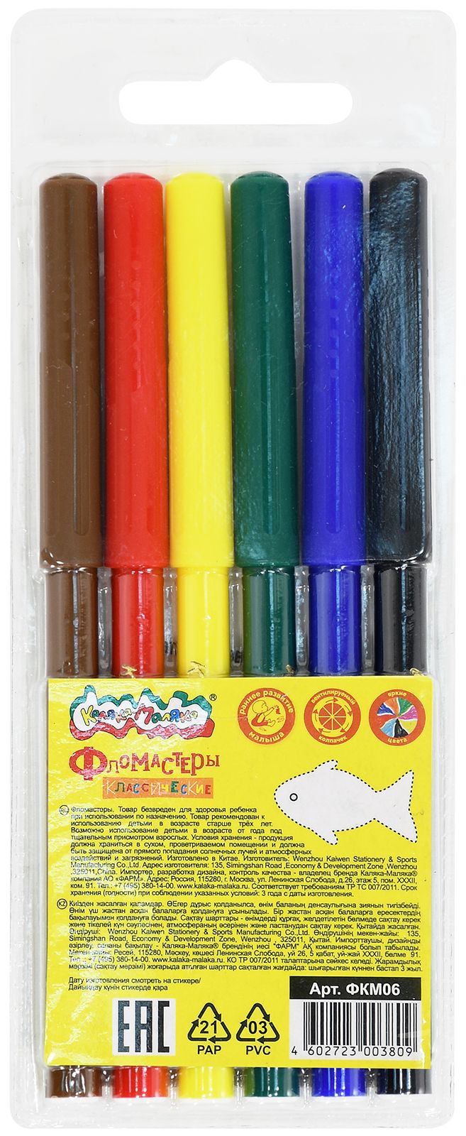 Количество цветов: 6 Наличие европодвеса: Да Форма наконечника: конический Тип фломастеров: классические Вид товара: Фломастеры Возраст: от 3 лет Мин. партия и варианты упаковок: 1 / 24 / 192 Фломастеры Каляка-Маляка утолщенные классические 6 цв. круглый корпус, легкосмываемые, блистер