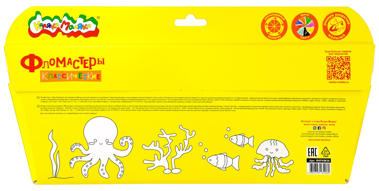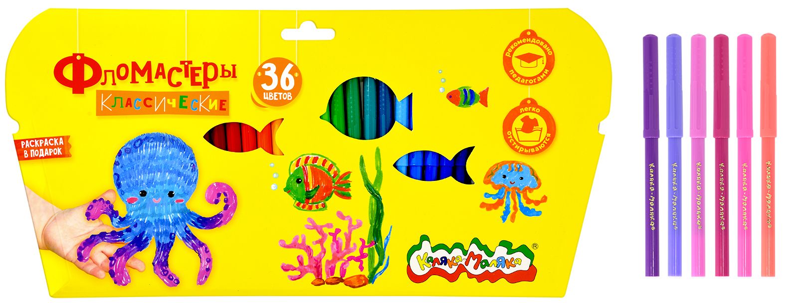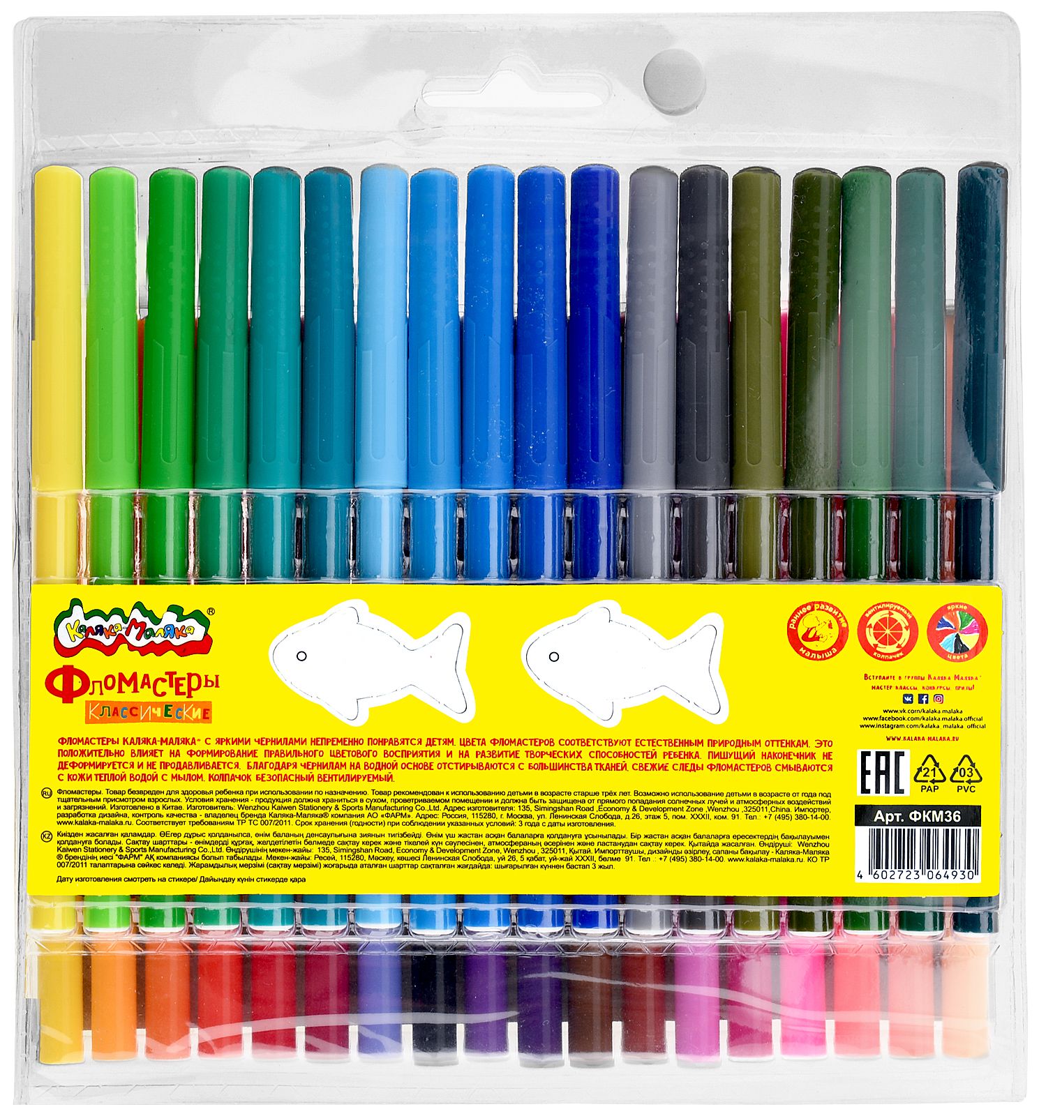 Количество цветов: 36 Наличие европодвеса: Да Форма наконечника: пулевидный Тип фломастеров: классические Вид товара: Фломастеры Возраст: от 3 лет Мин. партия и варианты упаковок: 1 / 12 / 72 Фломастеры Каляка-Маляка классические 36 цв. круглый корпус, легкосмываемые, блистер