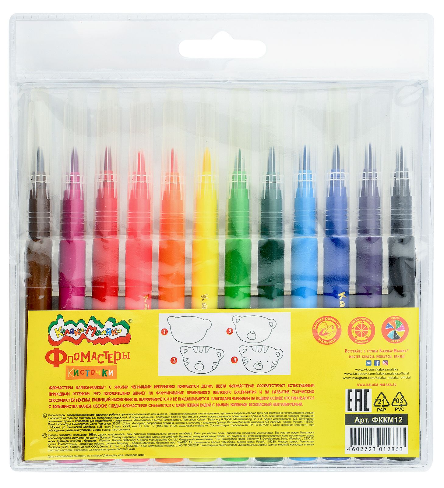 Количество цветов: 12 Наличие европодвеса: Да Форма наконечника: кистевидный Тип фломастеров: классические Вид товара: Фломастеры-кисточки Возраст: от 3 лет Мин. партия и варианты упаковок: 1 / 12 / 192 Фломастеры-кисточки Каляка-Маляка классические 12 цв. круглый корпус, легкосмываемые, блистер