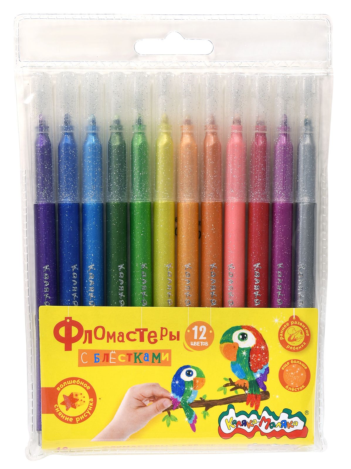Количество цветов: 12 Наличие европодвеса: Да Форма наконечника: конический Тип фломастеров: с блёстками Вид товара: Фломастеры Возраст: от 3 лет Мин. партия и варианты упаковок: 1 / 24 / 192 -