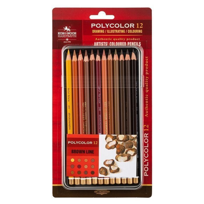 Мягкие профессиональные цветные карандаши со специально подобранной палитрой коричневых оттенков в металлической коробке. Толщина корпуса 7 мм, толщина грифеля 3,8 мм.