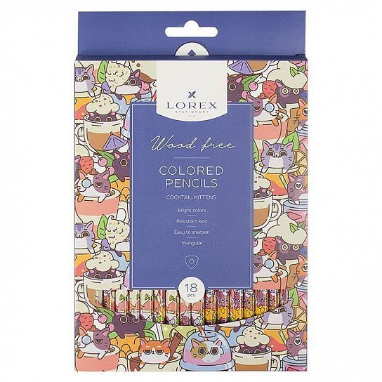 Материал: пластик Количество цветов: 18 Наличие европодвеса: Да Упаковка: картонная упаковка Мягкость грифеля: НВ Вид товара: Набор цветных карандашей Мин. партия и варианты упаковок: 1 / 12 / 144 Набор цветных карандашей LOREX COCKTAIL KITTENS 18 цв. трехгранные, пластиковые, принт на корпусе, в картонной упаковке