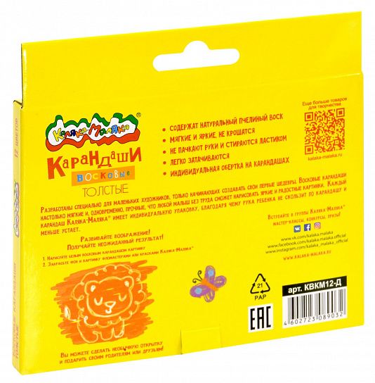 Благодаря специально разработанному составу карандашей — они совершенно не пачкают руки, легко затачиваются и стираются ластиком, пишут мягко на любой поверхности. Мягкость рисования повышена, так как в новой формуле содержится увеличенное количество пчелиного воска. Каждый карандаш Каляка-Маляка® имеет утолщенный корпус и индивидуальную упаковку, благодаря чему рука ребенка не скользит по карандашу и меньше устает.Набор упакован в картонную коробку с европодвесом