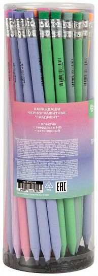Трендовые оттенки корпуса чернографитных карандашей Schoolformat из коллекции "ГРАДИЕНТ" гармонично смотрятся в упаковке, по отдельности – каждый цвет уникален. Узоры и записи, созданные этими карандашами, можно легко удалить – для этого на каждом карандаше крепко закреплен яркий ластик в цвет корпуса.Все карандаши в количестве 48 штук заточенные, круглой формы, твердость грифеля HB. Материал - пластик, тонированная масса, ассорти 6 цветов. Упаковка - тубус.