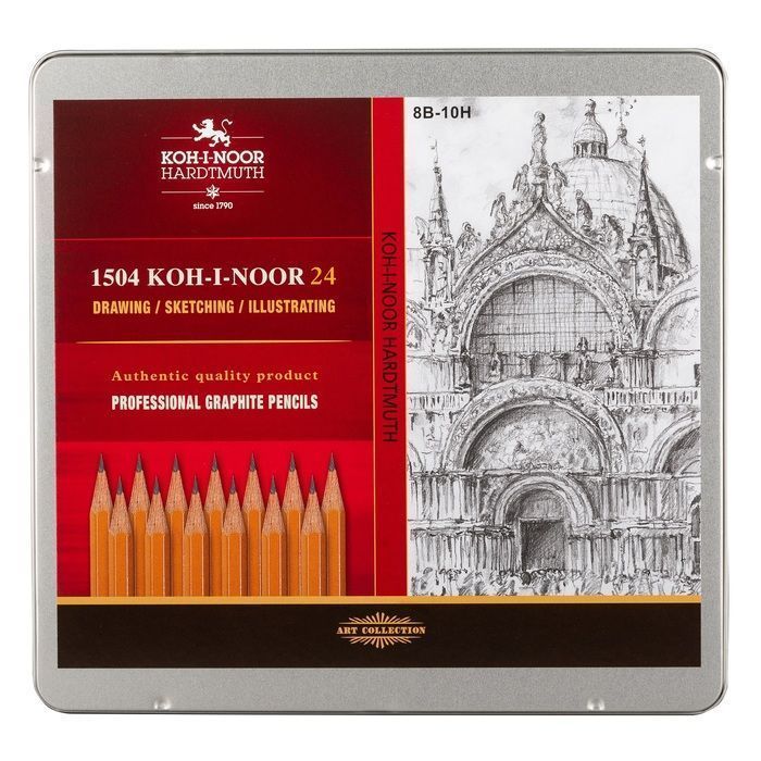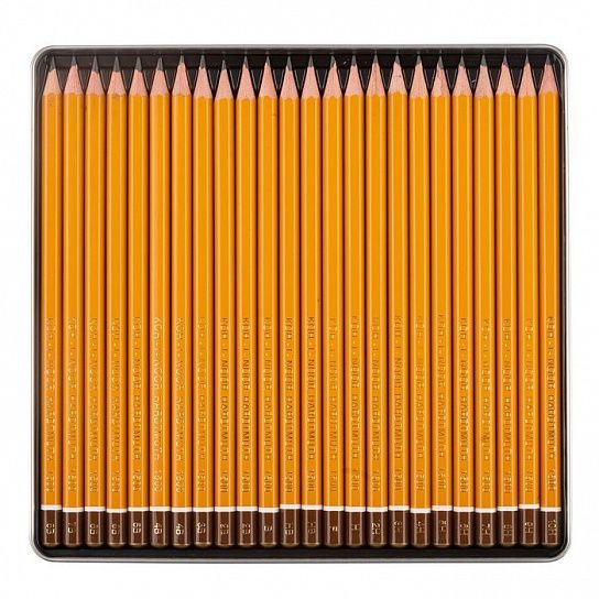 Роскошный набор легендарных желтых чернографитных карандашей KOH-I-NOOR из калифорнийского кедра в подарочной металлической коробке. 20 градаций твердости от 8B до 10H, включая F, станет прекрасным подарком и источником вдохновения не только для профессиональных художников и графиков, но и для любителей, делающих первые шаги в рисовании.Твердость от 8B до 10H.Карандаши заточены, без ластика.Форма корпуса - шестигранная.Диаметр грифеля 2-2,5 мм.Диаметр корпуса 7 мм.