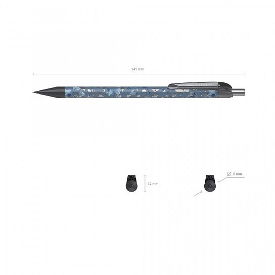 Механический карандаш круглой формы с матовым корпусом. Четыре дизайна корпуса с фольгированными элементами с покрытием soft touch и хромированной кнопкой. Оснащен удобным полупрозрачным клипом. Твердость HB. Диаметр грифеля - 0.5 мм.
