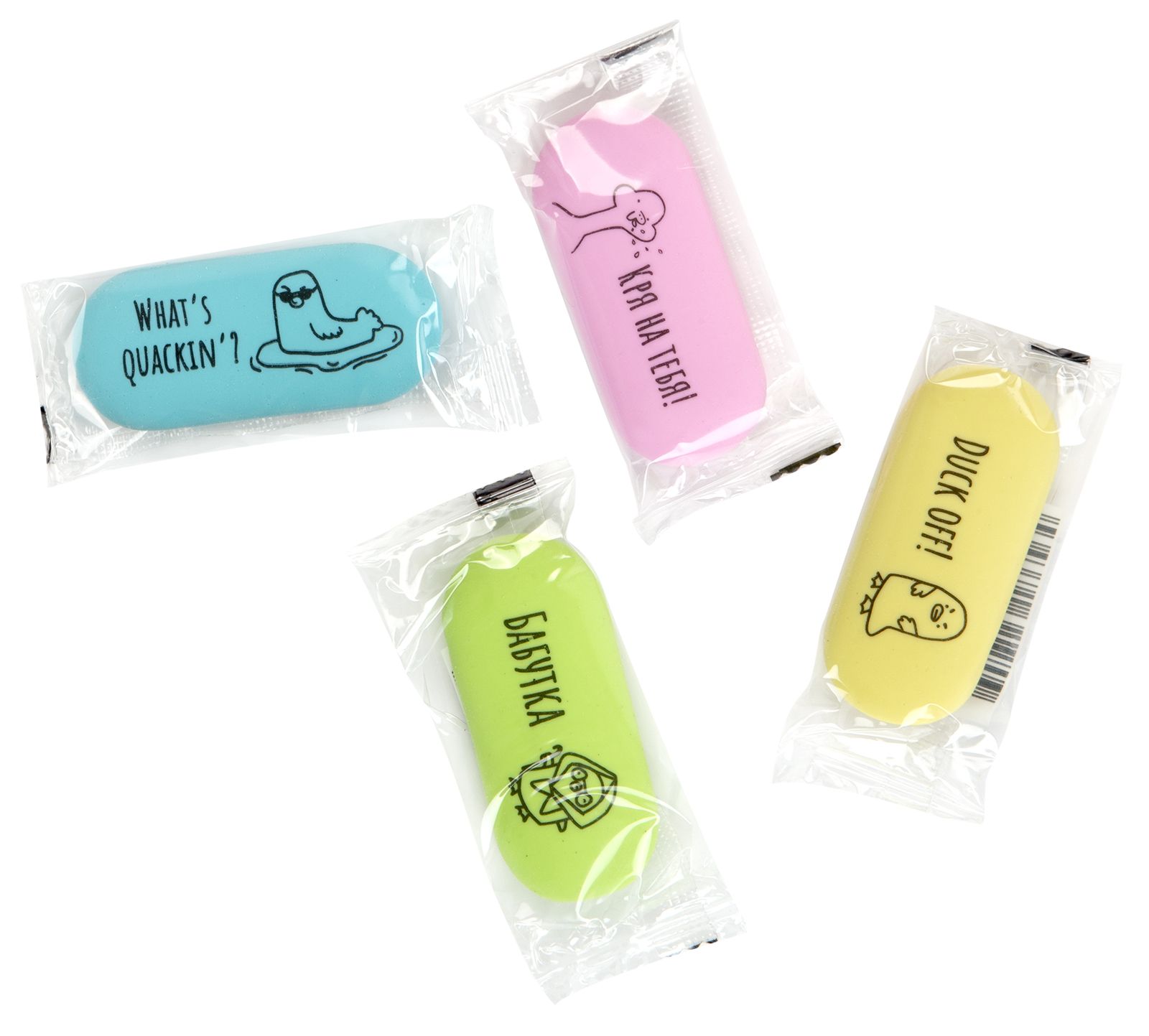 Цвет: ассорти Размер: 55х25х10 мм Наличие европодвеса: Да Упаковка: пакет Вид чертежных принадлежностей: Набор ластиков Материал: термопластичная резина Мин. партия и варианты упаковок: 1 / 36 / 216 Набор ластиков Schoolformat МИЛЫЕ УТОЧКИ, термопластичная резина, 55х25х10 мм овальный, ассорти, мягкий, 4шт в пакете