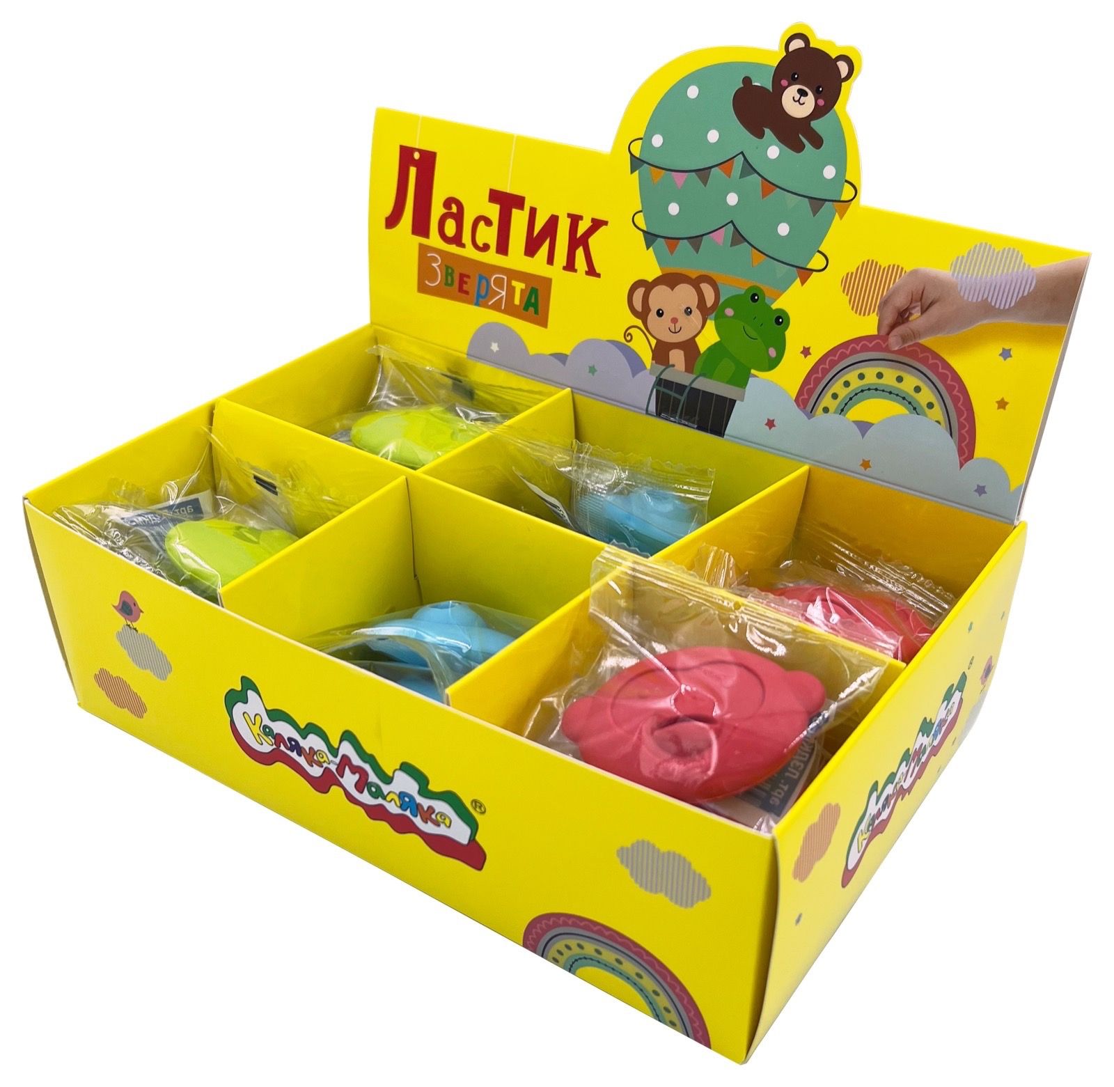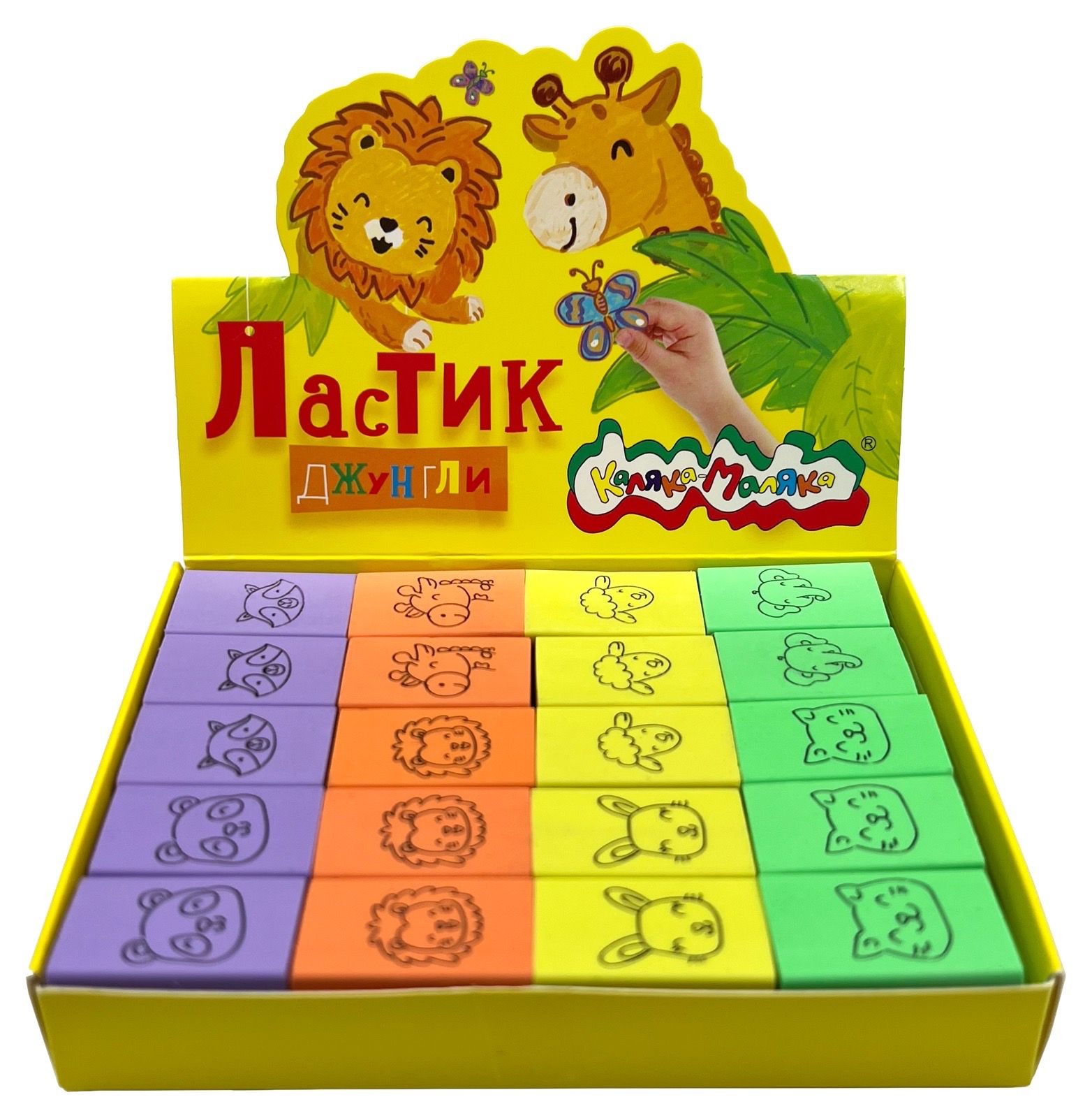 Цвет: ассорти Размер: 55х39х16 мм Наличие европодвеса: Нет Упаковка: дисплей Вид чертежных принадлежностей: Ластик Материал: термопластичная резина Мин. партия и варианты упаковок: 1 / 24 / 480 Ластик Каляка-Маляка ЗВЕРЯТА, термопластичная резина, 55х39х16 мм фигурный, ассорти, мягкий, индивидуальный ШК