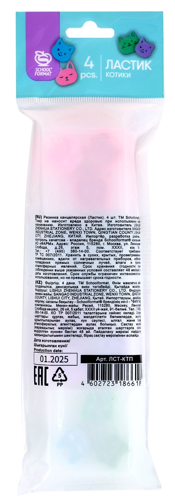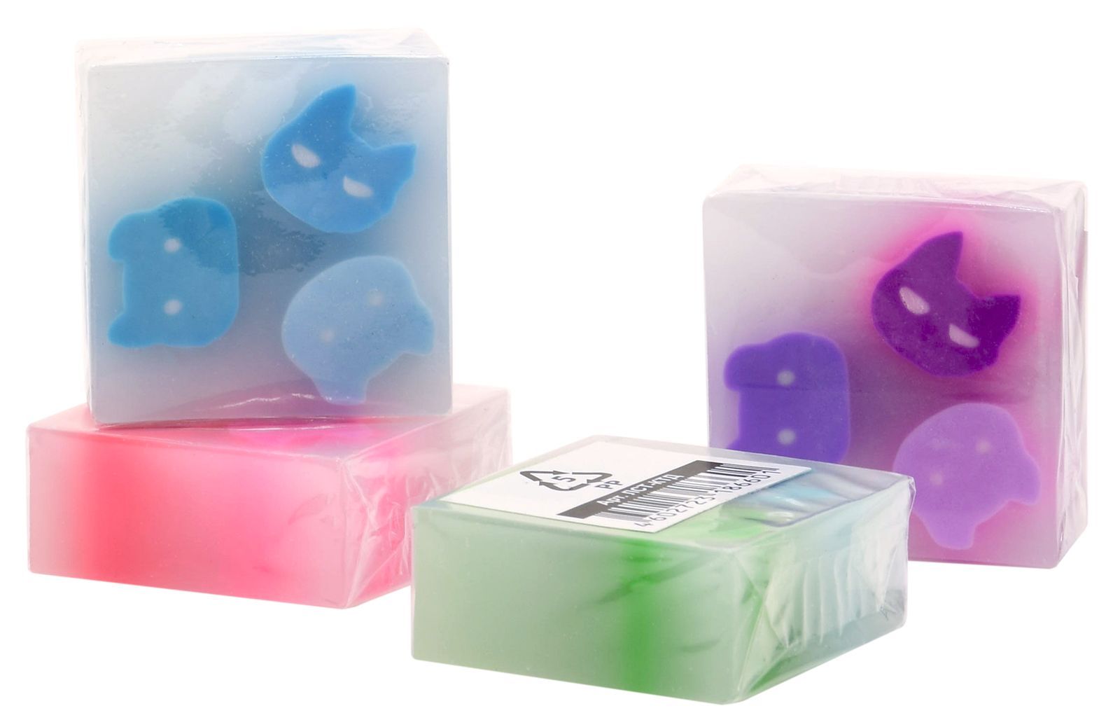 Цвет: ассорти Размер: 34х34х14 мм Наличие европодвеса: Да Упаковка: пакет Вид чертежных принадлежностей: Набор ластиков Материал: ПВХ Мин. партия и варианты упаковок: 1 / 12 / 144 Набор ластиков Schoolformat КОТИКИ, ПВХ, 34х34х14 мм прямоугольный, ассорти, мягкий, 4 шт в пакете