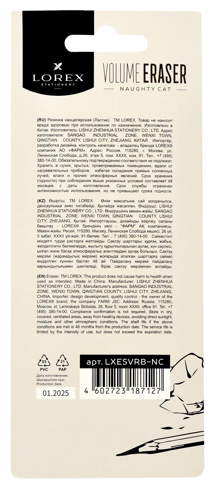 Цвет: ассорти Размер: 35х21х10 мм Наличие европодвеса: Нет Упаковка: дисплей Вид чертежных принадлежностей: Ластик Материал: ПВХ Мин. партия и варианты упаковок: 1 / 36 / 1152 Ластик LOREX VOLUME ERASER NAUGHTY CAT ПВХ 35х21х10 мм прямоугольный, ассорти, мягкий, индивидуальный ШК