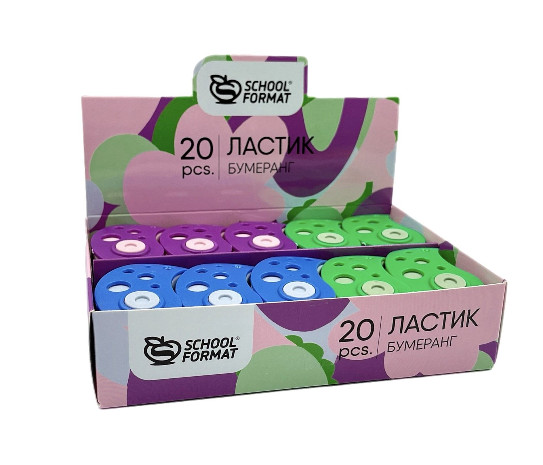 Цвет: ассорти Размер: 50х32х18 мм Наличие европодвеса: Нет Упаковка: дисплей Вид чертежных принадлежностей: Ластик Материал: термопластичная резина Мин. партия и варианты упаковок: 1 / 20 / 600 Ластик Schoolformat БУМЕРАНГ, термопластичная резина, 50х32х18 мм фигурный, ассорти, мягкий, пластиковый держатель, индивидуальный ШК