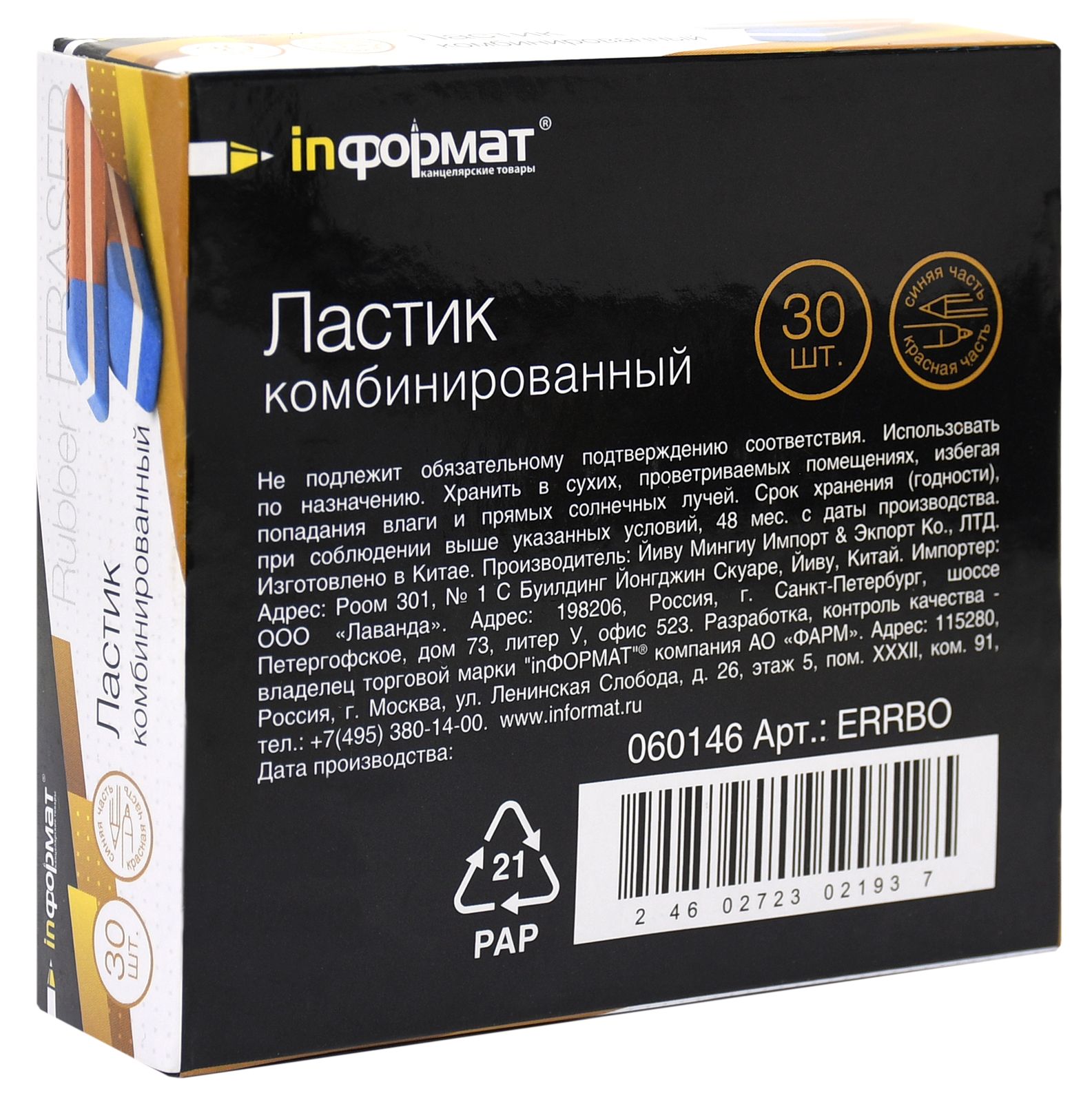 Цвет: красно-синий Размер: 53х19х9 мм Наличие европодвеса: Нет Упаковка: дисплей Вид чертежных принадлежностей: Ластик Материал: каучук Мин. партия и варианты упаковок: 1 / 30 / 1200 Ластик INFORMAT КОМБИНИРОВАННЫЙ каучук 53х19х9 мм скошенный, красно-синий комбинированный