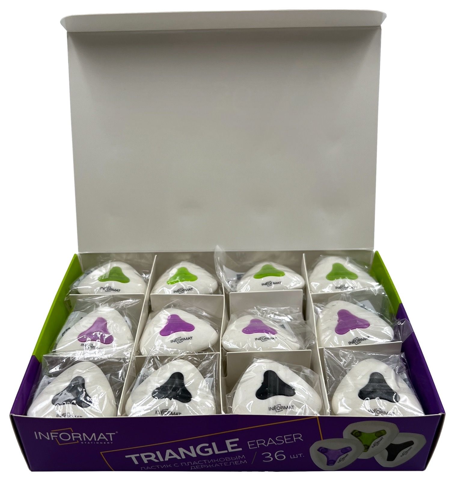 Цвет: ассорти Размер: 40х40х12 мм Наличие европодвеса: Нет Упаковка: дисплей Вид чертежных принадлежностей: Ластик Материал: термопластичная резина Мин. партия и варианты упаковок: 1 / 36 / 864 Ластик INFORMAT TRIANGLE термопластичная резина, 40х40х12 мм треугольный, ассорти, мягкий, пластиковая центровка, индивидуальный ШК