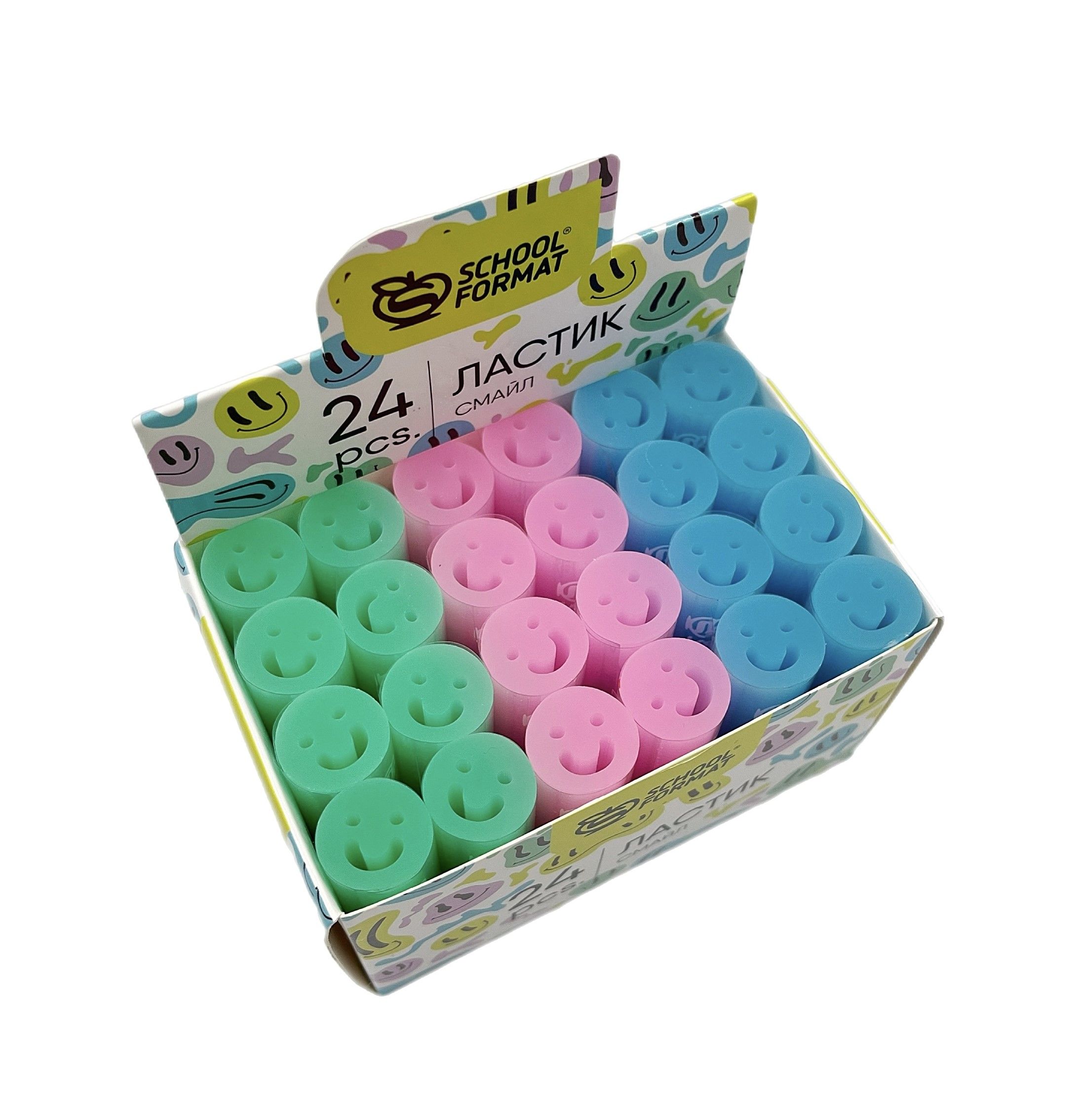 Цвет: ассорти Размер: 55х16х16 мм Наличие европодвеса: Нет Упаковка: дисплей Вид чертежных принадлежностей: Ластик Материал: ПВХ Мин. партия и варианты упаковок: 1 / 24 / 864 -