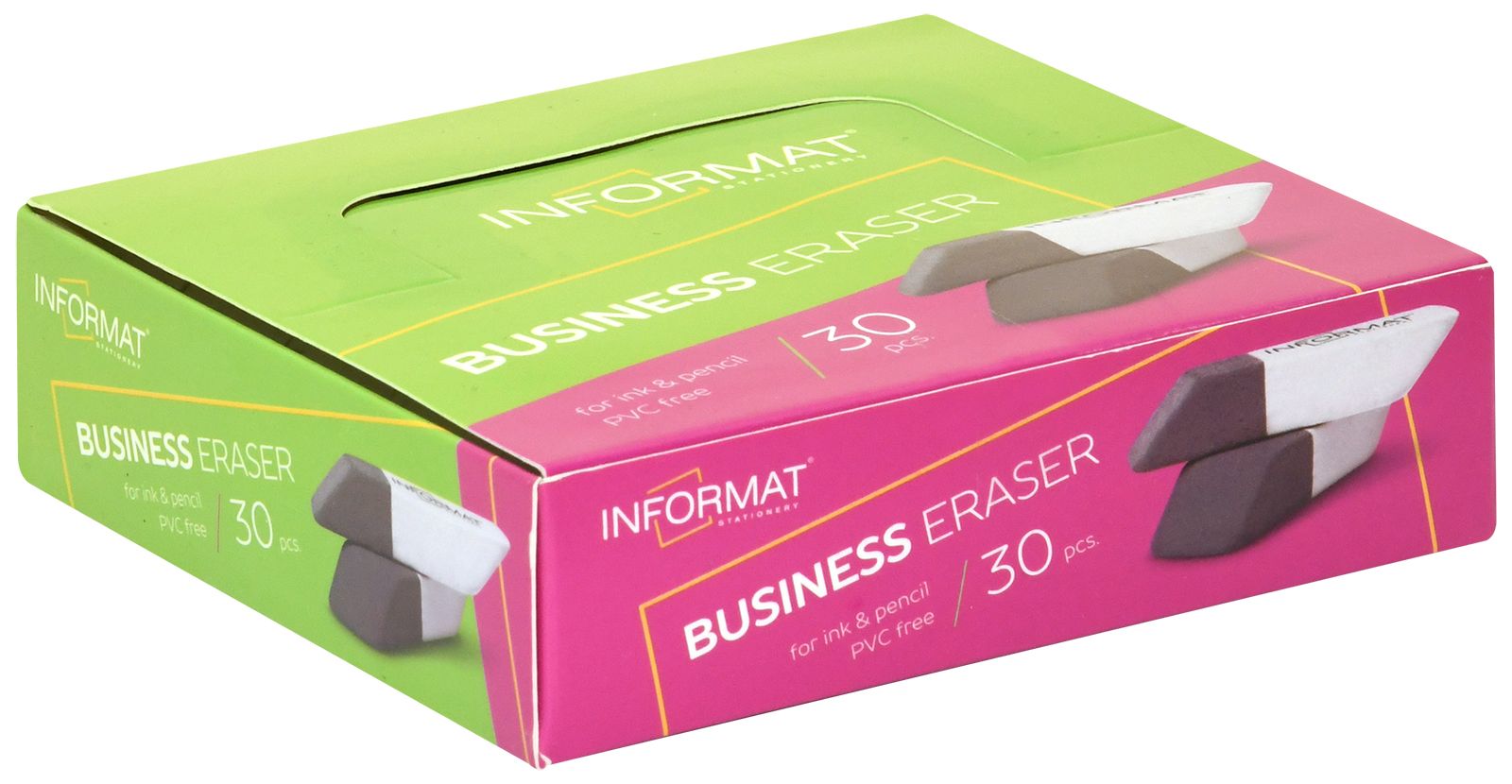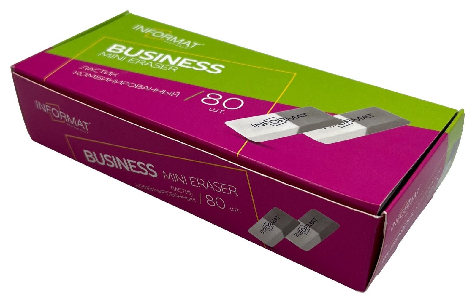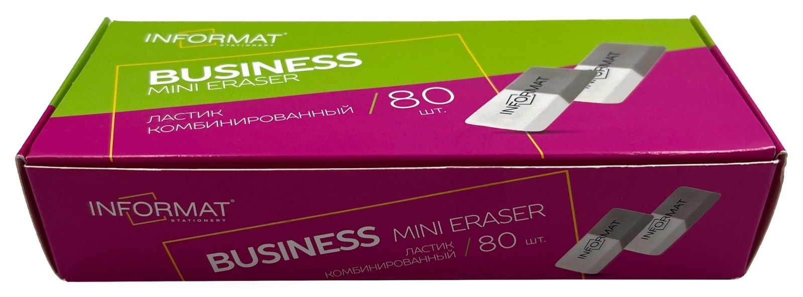 Цвет: серо-белый Размер: 41х14х8 мм Наличие европодвеса: Нет Упаковка: дисплей Вид чертежных принадлежностей: Ластик Материал: термопластичная резина Мин. партия и варианты упаковок: 1 / 80 / 3200 Ластик INFORMAT БИЗНЕС мини термопластичная резина, 41х14х8 мм скошенный, серо-белый комбинированный, индивидуальный ШК