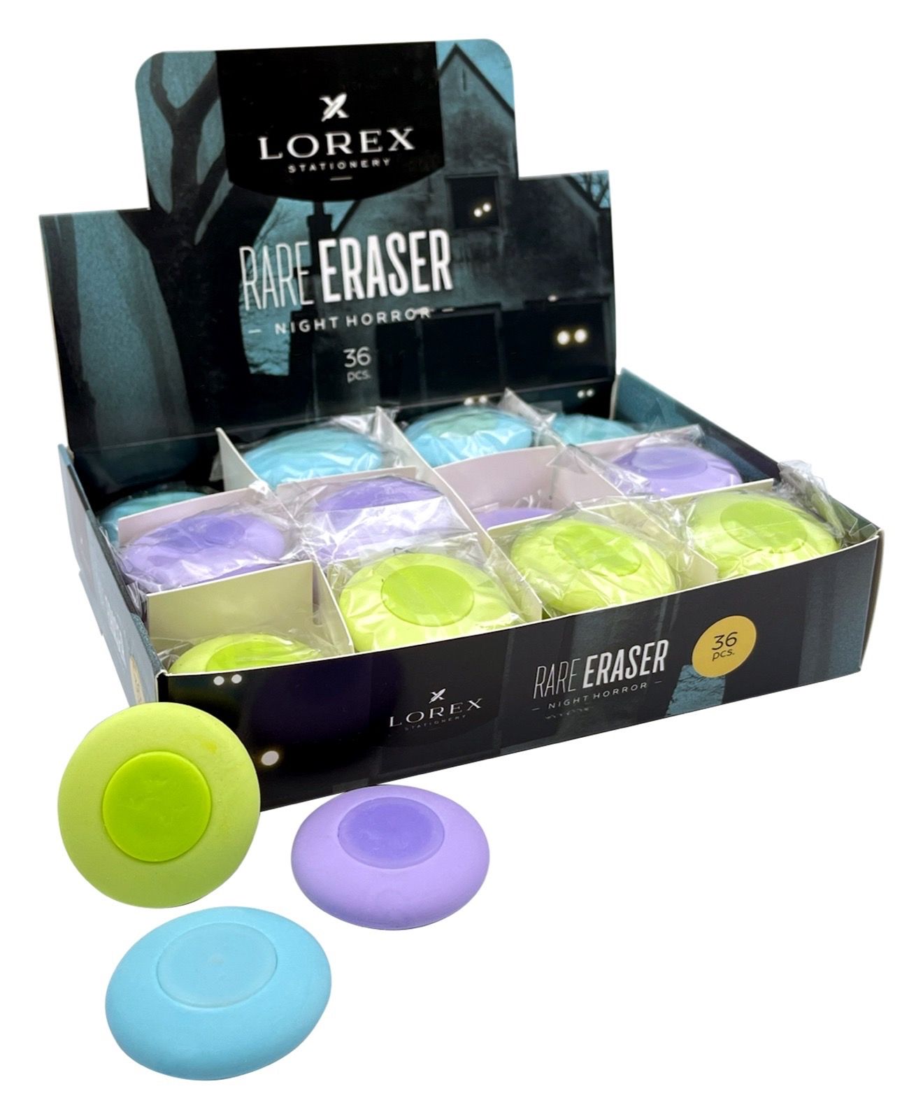 Цвет: ассорти Размер: 45х12х10 мм Наличие европодвеса: Нет Упаковка: дисплей Вид чертежных принадлежностей: Ластик Материал: термопластичная резина Мин. партия и варианты упаковок: 1 / 36 / 864 Ластик LOREX RARE ERASER NIGHT HORROR, термопластичная резина, 45х12х10 мм круглый, ассорти, мягкий, пластиковая центровка, индивидуальный ШК