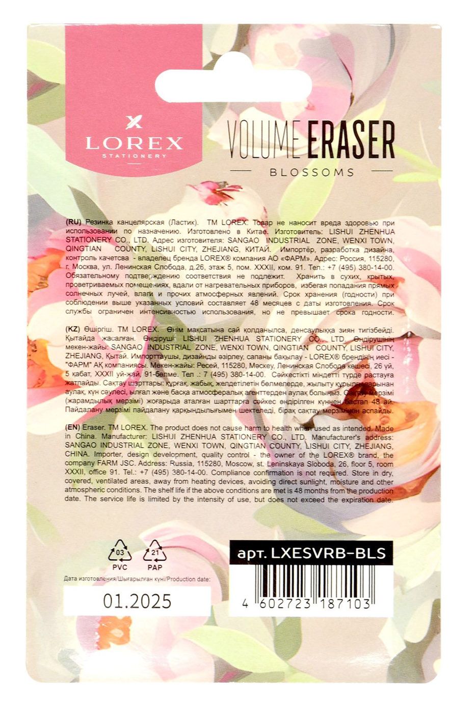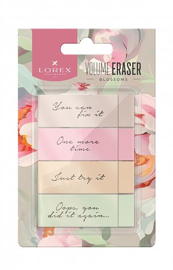 Цвет: ассорти Размер: 60х20х10 мм Наличие европодвеса: Да Упаковка: блистер Вид чертежных принадлежностей: Набор ластиков Материал: термопластичная резина Мин. партия и варианты упаковок: 1 / 12 / 288 Набор ластиков LOREX VOLUME ERASER BLOSSOMS, термопластичная резина, 60х20х10 мм скошенный, ассорти, мягкий, 4 шт в блистере
