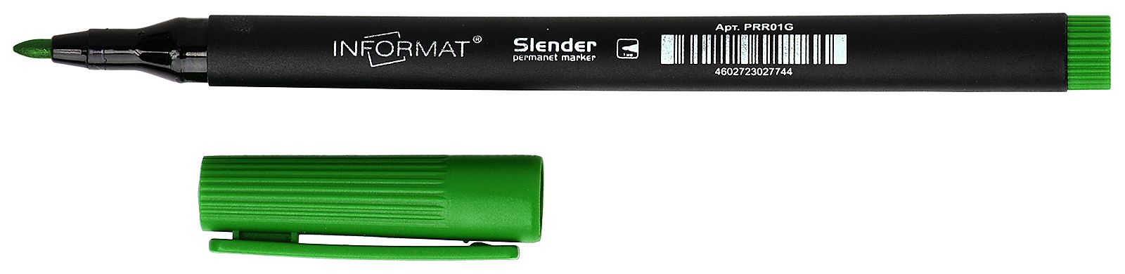 Цвет: зеленый Количество в упаковке, шт: 1 Тип чернил: водостойкие Форма наконечника: круглый Вид маркера: Маркер перманентный Количество пишущих сторон: односторонний Мин. партия и варианты упаковок: 1 / 12 / 144 / 1728 Маркер перманентный INFORMAT SLENDER 1 мм зеленый, круглый наконечник
