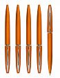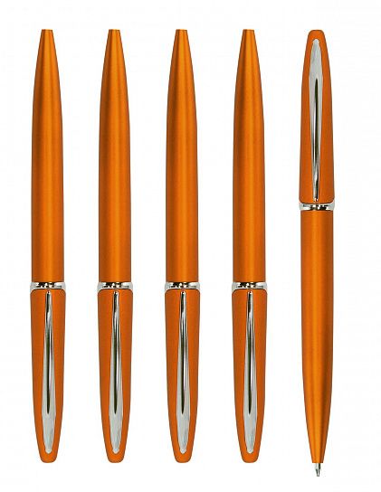 Автоматическая шариковая ручка. Имеет презентабельный вид. Оранжевый корпус. Обеспечивают комфортное письмо на бумаге любой плотности. Цвет чернил — синий. Пишущий узел — 0,7 мм. Длина стержня — 105 мм, с упором.