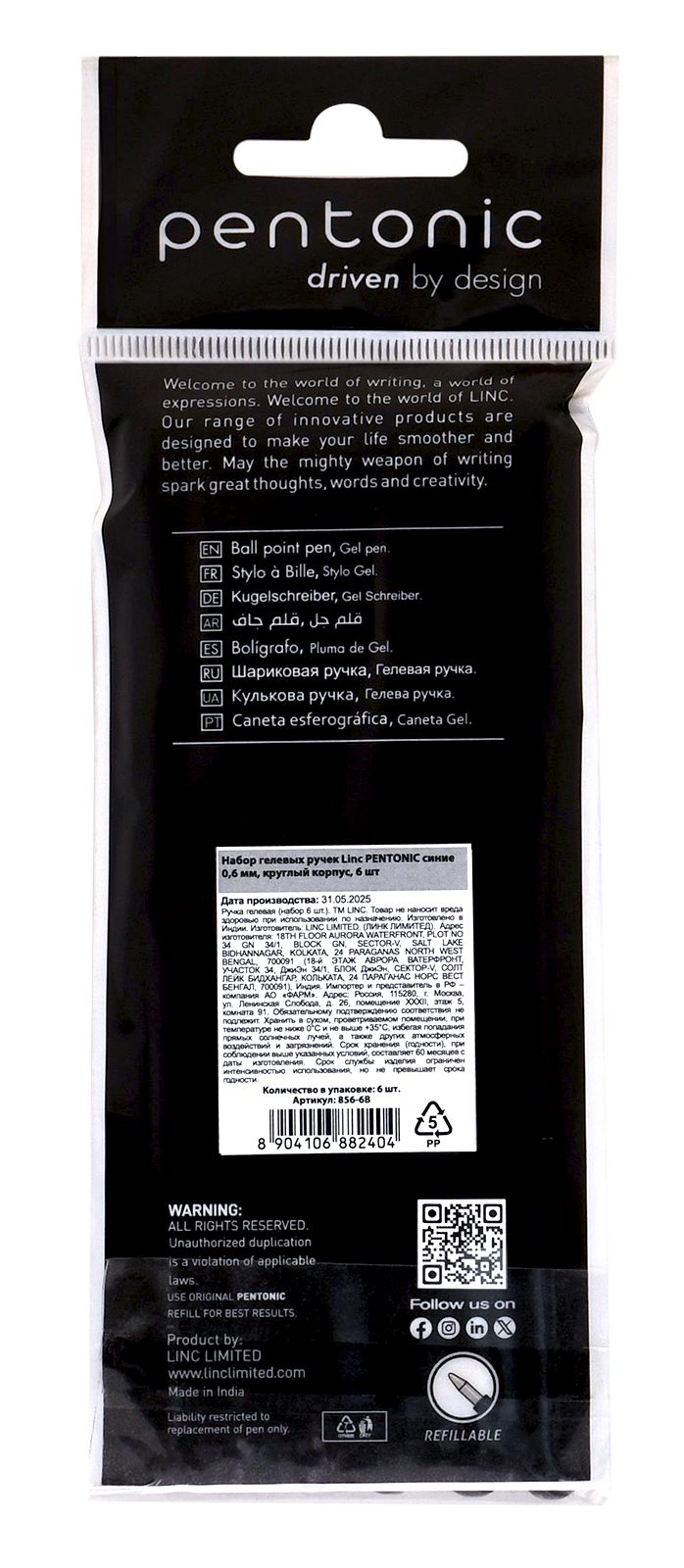 Количество в упаковке, шт: 6 Диаметр, мм: 7 Цвет чернил: синий Количество цветов: 1 Толщина линии письма, мм: 0,30 Цвет корпуса: черный Мин. партия и варианты упаковок: 1 / 20 / 240 Набор гелевых ручек Linc PENTONIC 0,6 мм синие, 6 шт