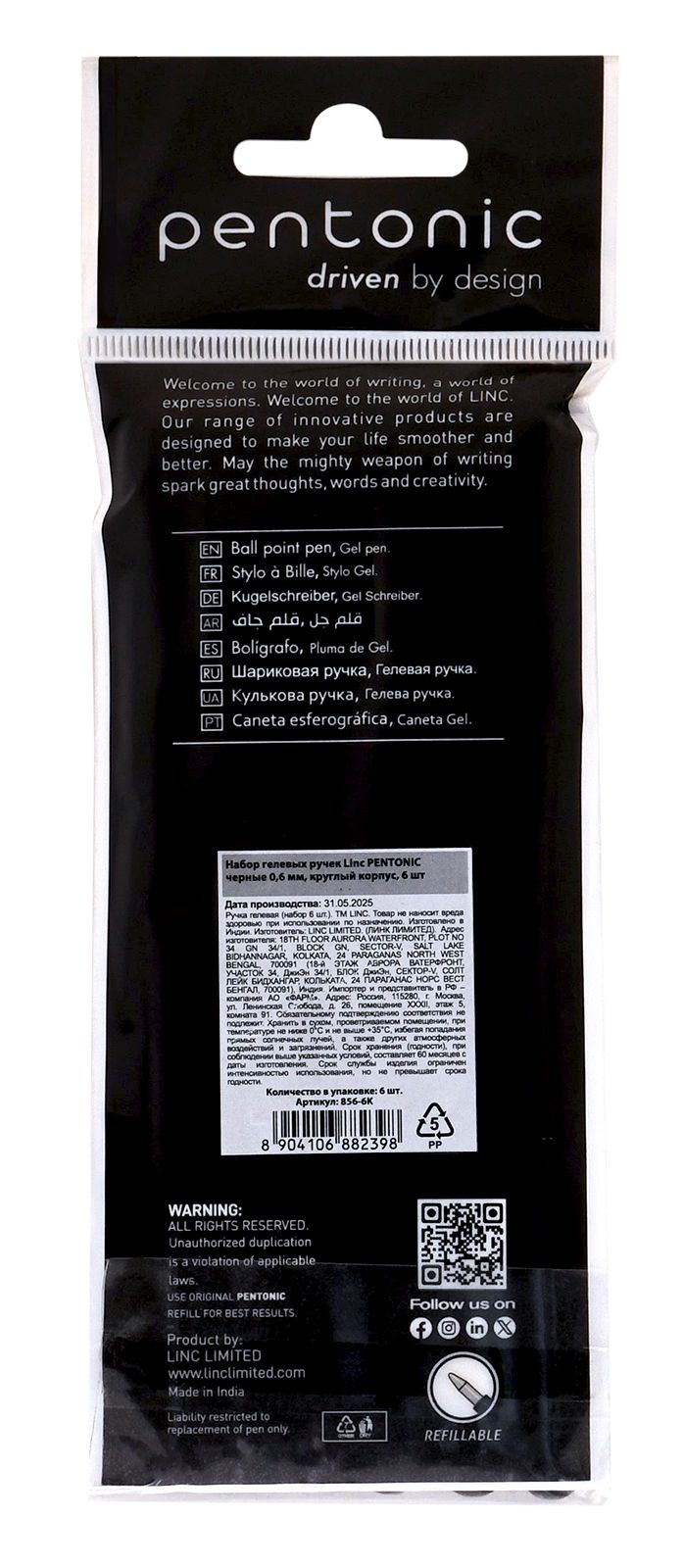 Количество в упаковке, шт: 6 Диаметр, мм: 7 Цвет чернил: черный Количество цветов: 1 Толщина линии письма, мм: 0,30 Цвет корпуса: черный Мин. партия и варианты упаковок: 1 / 20 / 240 Набор гелевых ручек Linc PENTONIC 0,6 мм черные, 6 шт
