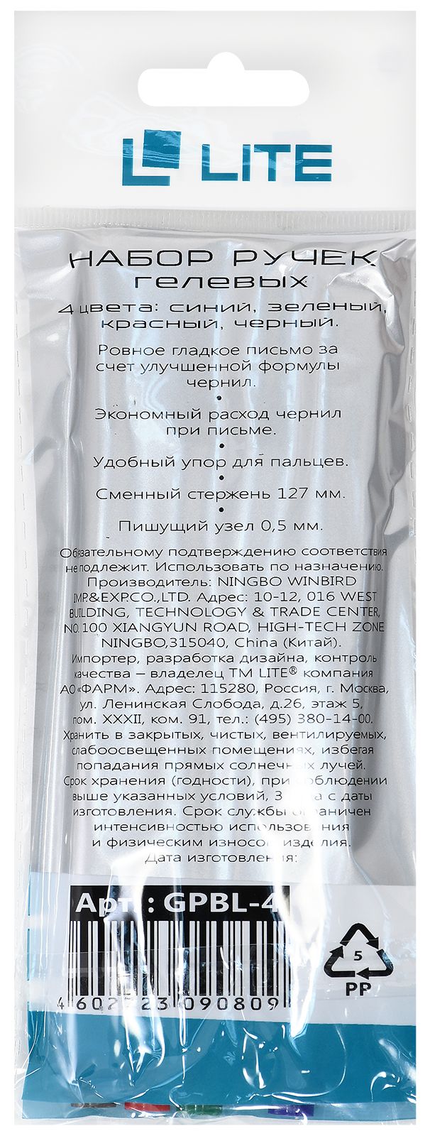 Количество в упаковке, шт: 4 Диаметр, мм: 9 Цвет чернил: ассорти Количество цветов: 4 Толщина линии письма, мм: 0,35 Цвет корпуса: прозрачный Мин. партия и варианты упаковок: 1 / 50 / 400 Набор гелевых ручек LITE 0,5 мм ассорти 4 цвета 4 шт