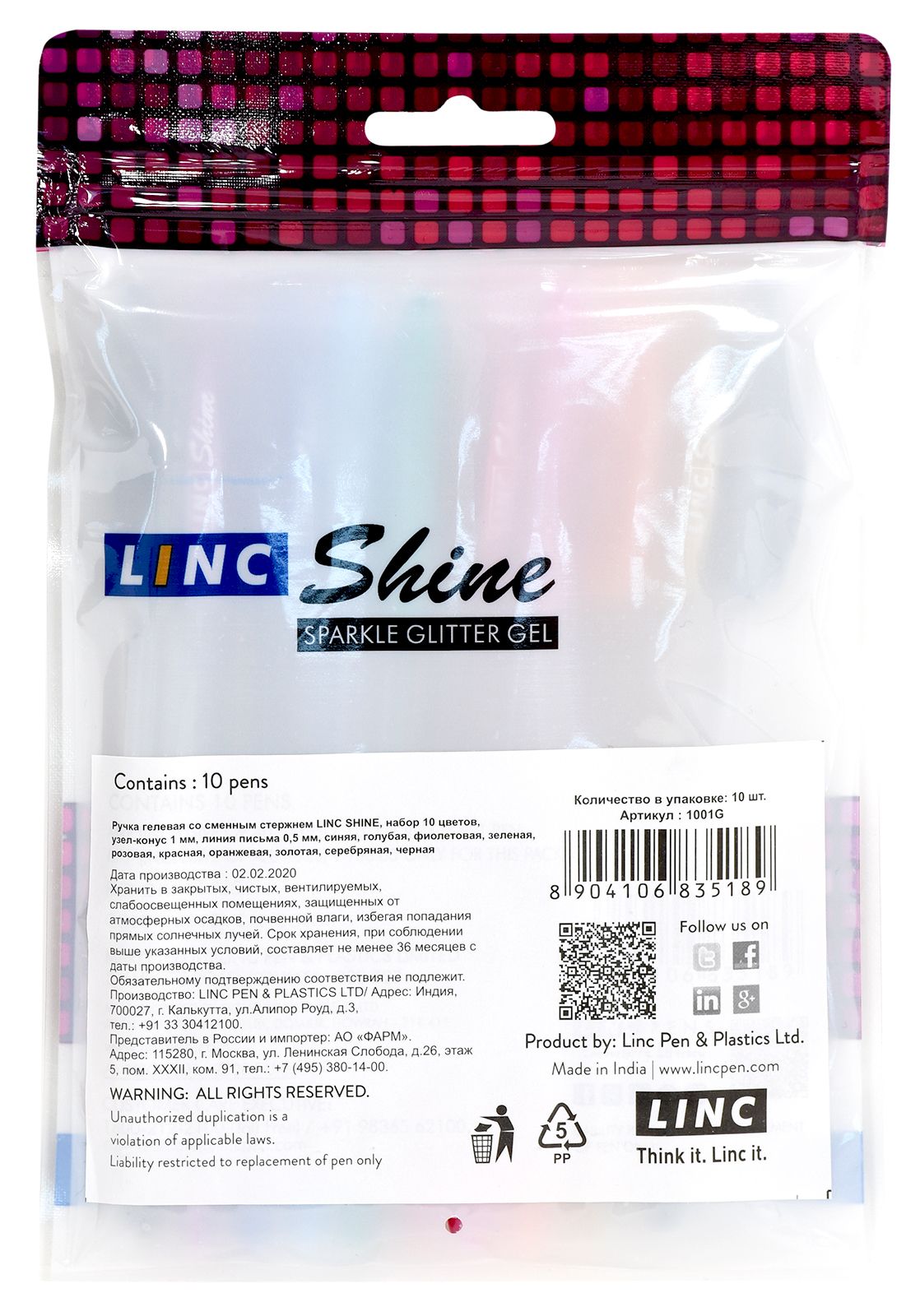 Количество в упаковке, шт: 10 Диаметр, мм: 9 Характеристика цвета: с блестками Цвет чернил: ассорти Количество цветов: 10 Толщина линии письма, мм: 0,70 Мин. партия и варианты упаковок: 1 / 10 / 120 Набор гелевых ручек LINC SHINE 1 мм ассорти с блестками 10 цветов 10 шт
