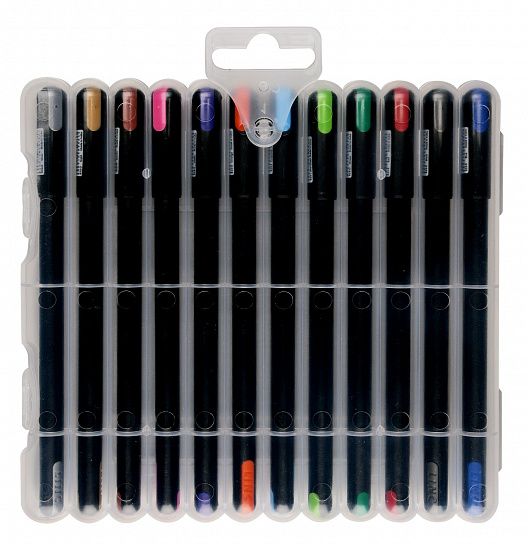 - В наборе 12 цветных гелевых ручек в элегантном пластиковом кейсе