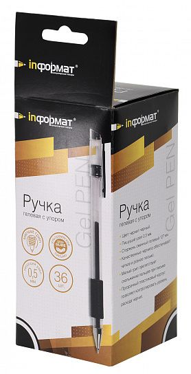Ручка гелевая INFORMAT - узнаваемый дизайн по доступной цене. Гелевая ручка INFORMAT обеспечивает легкое и мягкое письмо, яркие и насыщенные линии. Чернила водостойкие, быстро высыхают и не размазываются. Мягкий резиновый грип делает письмо еще комфортнее. Прозрачный корпус позволяет контролировать уровень чернил. Цвет чернил — черный, пишущий узел — 0,5 мм, форма наконечника — классический конус. Длина стержня — 127 мм.